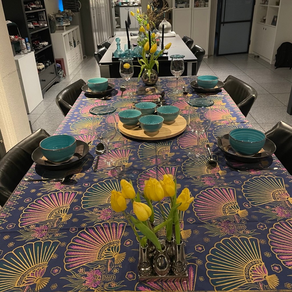 Heerlijk om zo te genieten van vriendschap en lekker eten. Maar het is wel een heel werk en vooral veel afwas. S’ochtends wel lekker buiten gezeten en geluncht. Jammer dat er morgen weer regen voorspeld is. Wel lekker weer om te knutselen: morgen komen zes dames voor Koffie en Kaart.