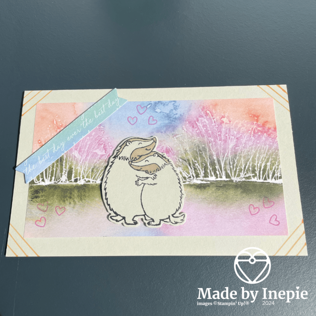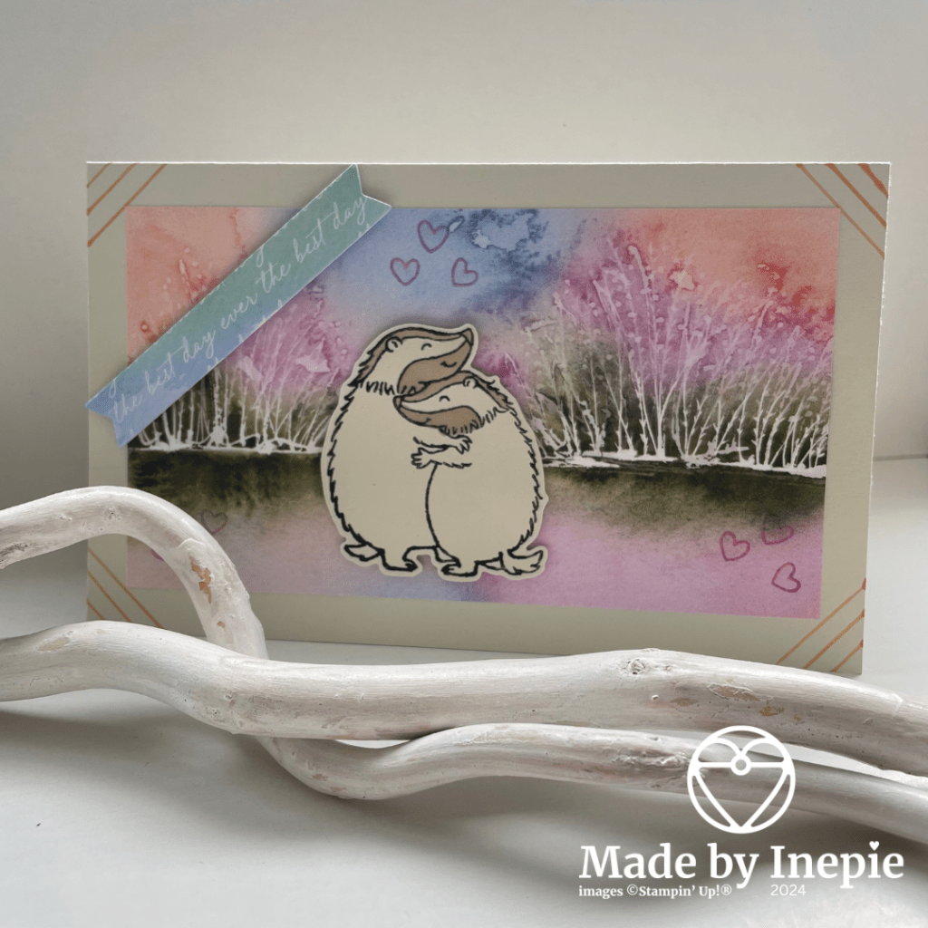 De mooie achtergrond mat is van het prachtige Thoughtful Journey Dsp ( 163303). Mijn grote favoriet uit de catalogus. Die kleuren en afbeeldingen : geweldig. De tekst heb ik met een stans uit de Hearts & Hugs stansen set gestanst uit een Thoughtful Journey Memories & More card Pack. Dit is echt de kracht van Stampin’ Up! het Dsp en de kaartjes passen perfect bij elkaar. En achterop vindt je de kleuren die erbij passen. Met Dimensionals heb ik de tekst en de Dassen opgeplakt en om een wat speelser effect te krijgen heb ik in de hoeken lijnen getrokken met de nieuwe kleur Peach Pie Stampin Marker. Nog wat hartejes gestempeld in de nieuwe kleur Petunia Pop en ook deze hartjes voorzien van wat Wink of Stella.