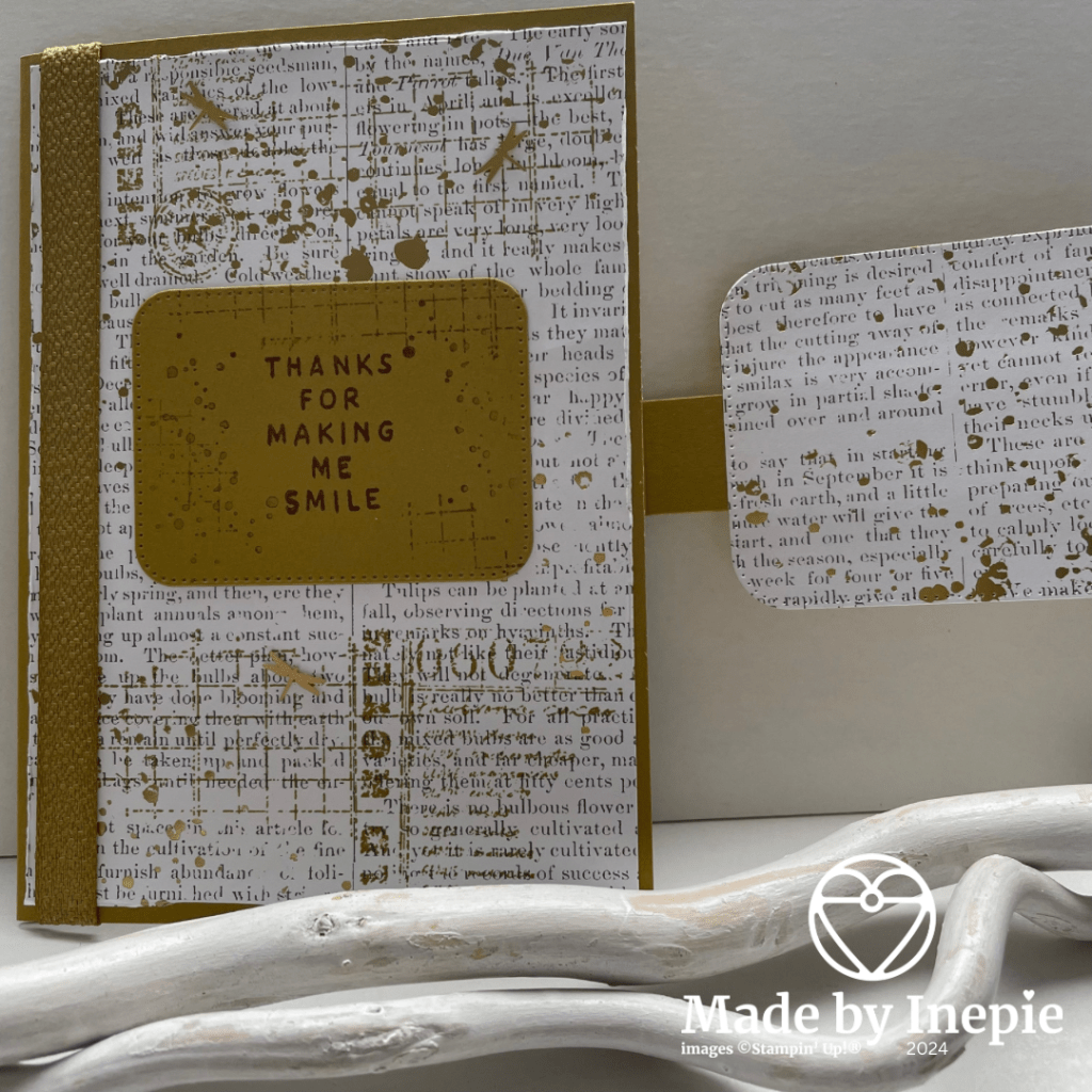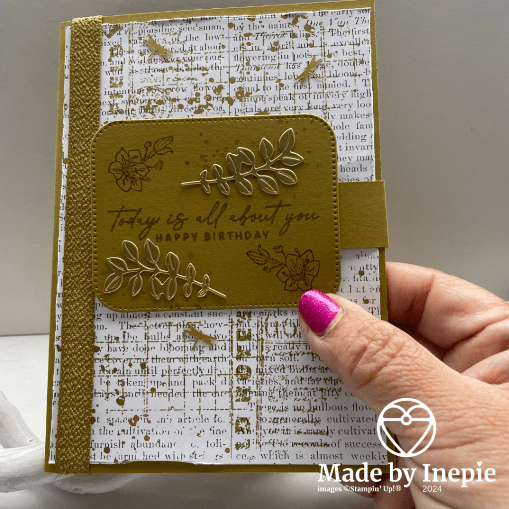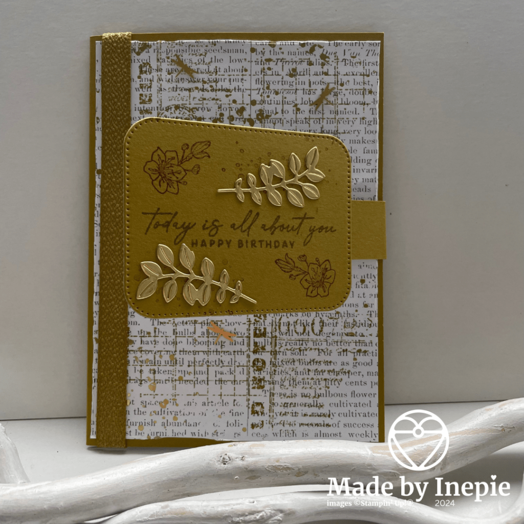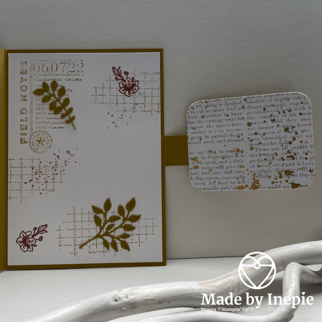 Ik heb deze funfold gemaakt. Basiskaart van Wild Wheat is gewoon 14,5 cm bij 21 cm gerild en gevouwen op 10,5 cm. Ik heb een stukje cardstock van 2 cm bij 14 cm gesneden en gerild op 7 cm. Deze heb ik aan de binnenkant van de kaart vastgeplakt en op het losse eind een rechthoek uit de Nested Essentials Dies.