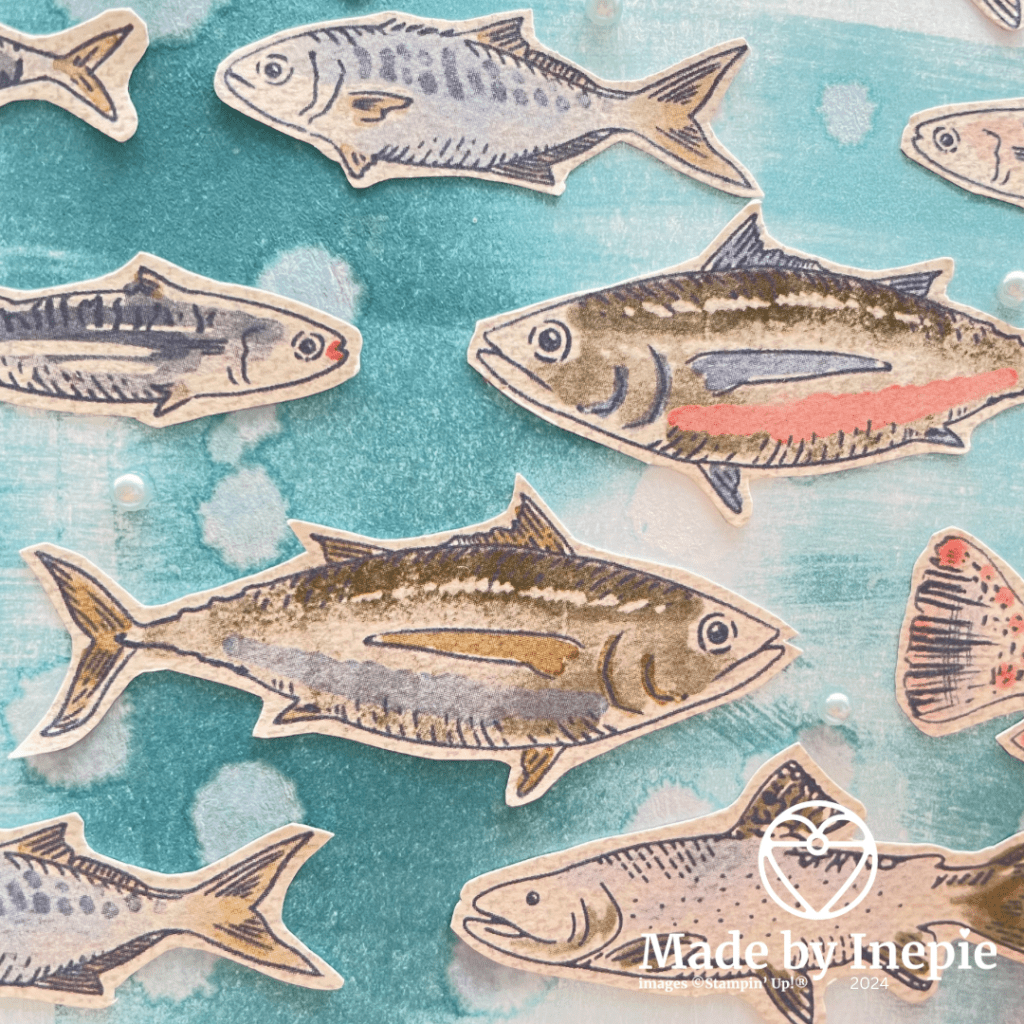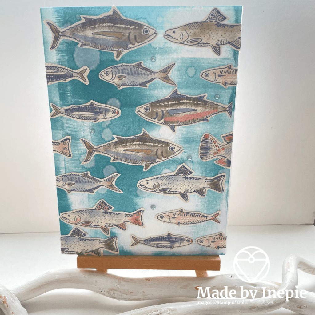 Heb jij ooit zo’n achtergrond gemaakt? Easypeasy en heel gaaf effect. Je ziet dat ik ook visjes heb gebruikt die aan de rand van het Dsp zaten en dus geen hele vissen waren. En sommige heb ik zelf afgeknipt. Ik heb ook nog vogeltjes liggen dus daar maak ik morgen een kaart mee. Morgen is de laatste dag van de catalogus. Een nieuw seizoen breekt aan. Helaas is ook bij Stampin’up! veel producten wat duurder geworden. Zoals in iedere winkel.
