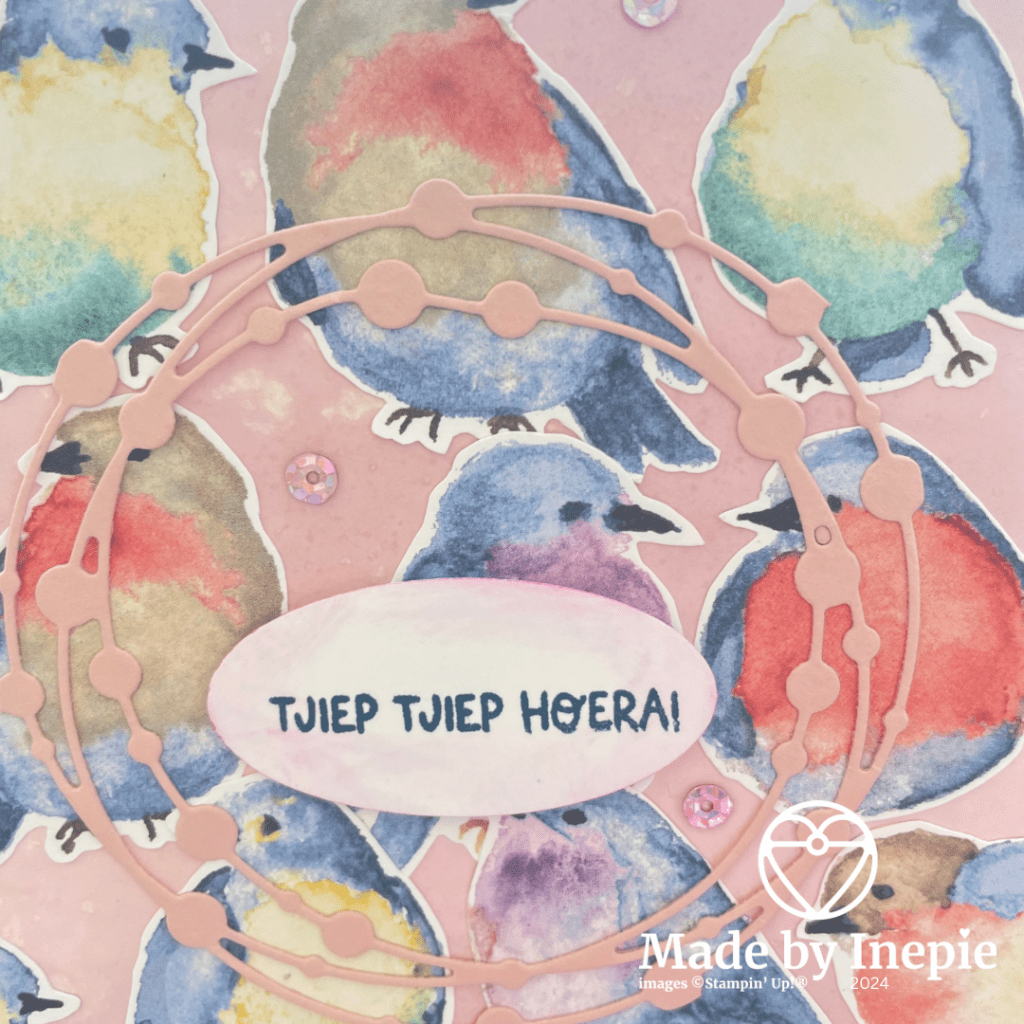 De tekst heb ik met de Duo Oval pons uitgeponst. Helaas is deze retired en kon ik hem gisteren al niet meer bestellen. Jammer want ik gebruikte hem vaak. De cirkel is uit de stansenset van Irrisisteble Blooms . Deze set is een Online Only product dus volgens mij blijft deze nog bestelbaar.