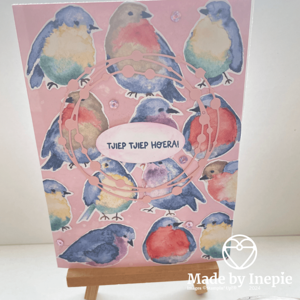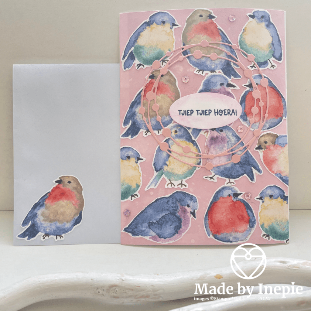 In de binnenkant van de kaart en op de envelop heb ik nog wat vogels geplakt. De tekst kwam trouwens uit de retired stempelset Tuinfluiters.