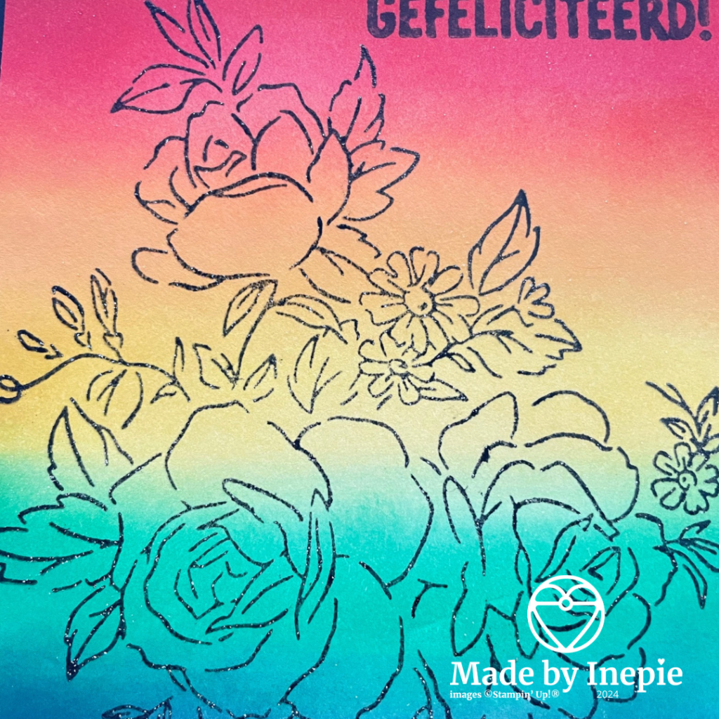 Zoals ik van de week liet zien had ik nog een geblende achtergrond over. Vandaag deze bestempeld met de mooie rozen uit de Layers of Beauty stempelset (163514). Eerst heb ik de stempel beinkt met Versamark, toen met Memento Tuxedo Black en daarna bestrooid met Clear Embossing poeder. Misschien niet zo goed te zien op de foto, maar dit geeft een klein reliëf en glansje.