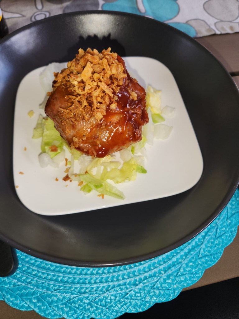 Hier weer gehakt op en dan de bacon eromheen vouwen en dan op de bbq en na 20 minuten aflakken met Bbq saus en dan gebakken uitjes erop. We serveerden het op een bedje van sla en het was heerlijk.