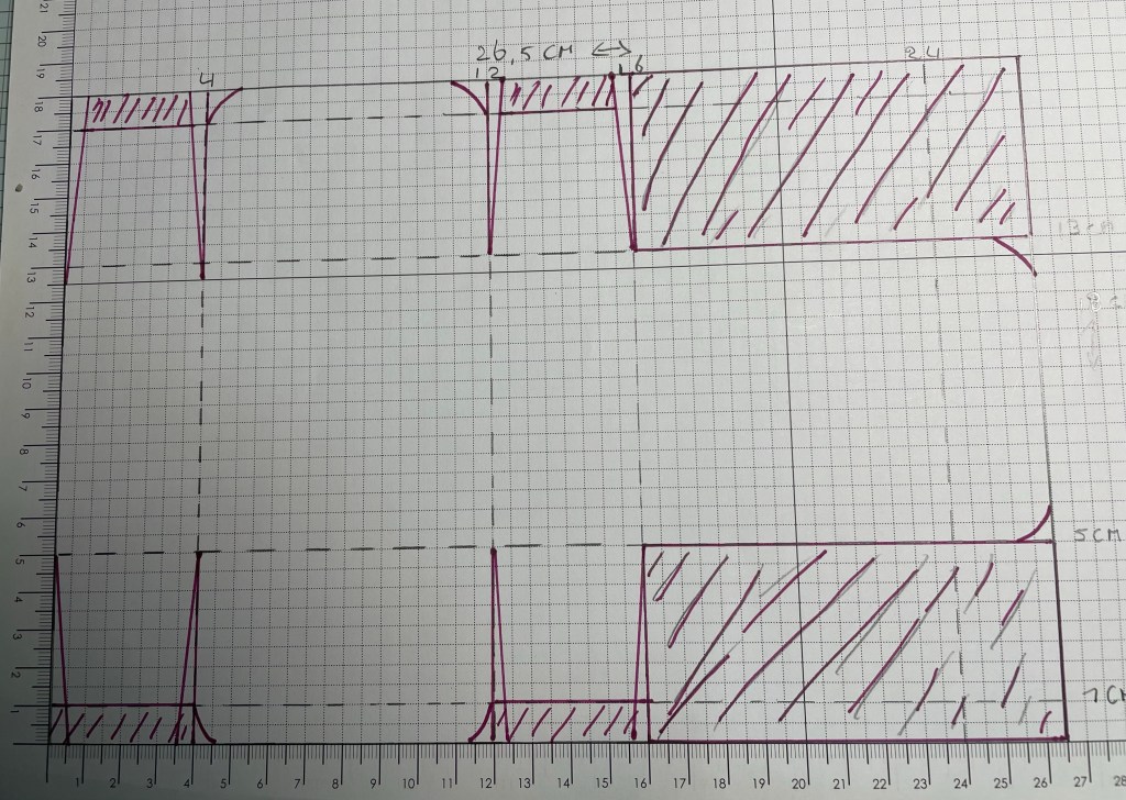 De paarse lijnen geven aan wat je moet knippen. De gestreepte stukken knip je weg. En de vierkanten knip je wat schuin weg. En de 3 flappen rond je af met een afrondpons.