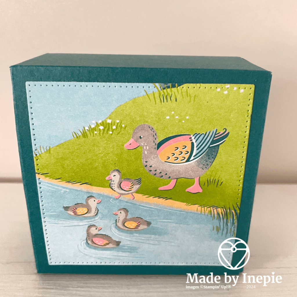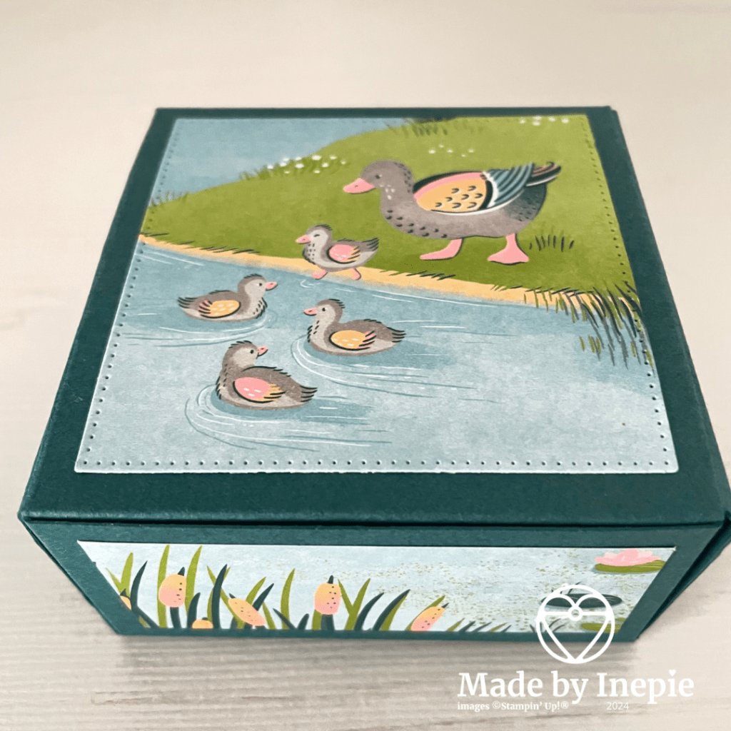 Vandaag eindelijk weer eens een doosje kunnen maken. Ik heb het schattige Lily Pond Lane Dsp ( 163342) gebruikt. De eendjes zijn zo leuk maar ook erg leuke achtergrond dessins.