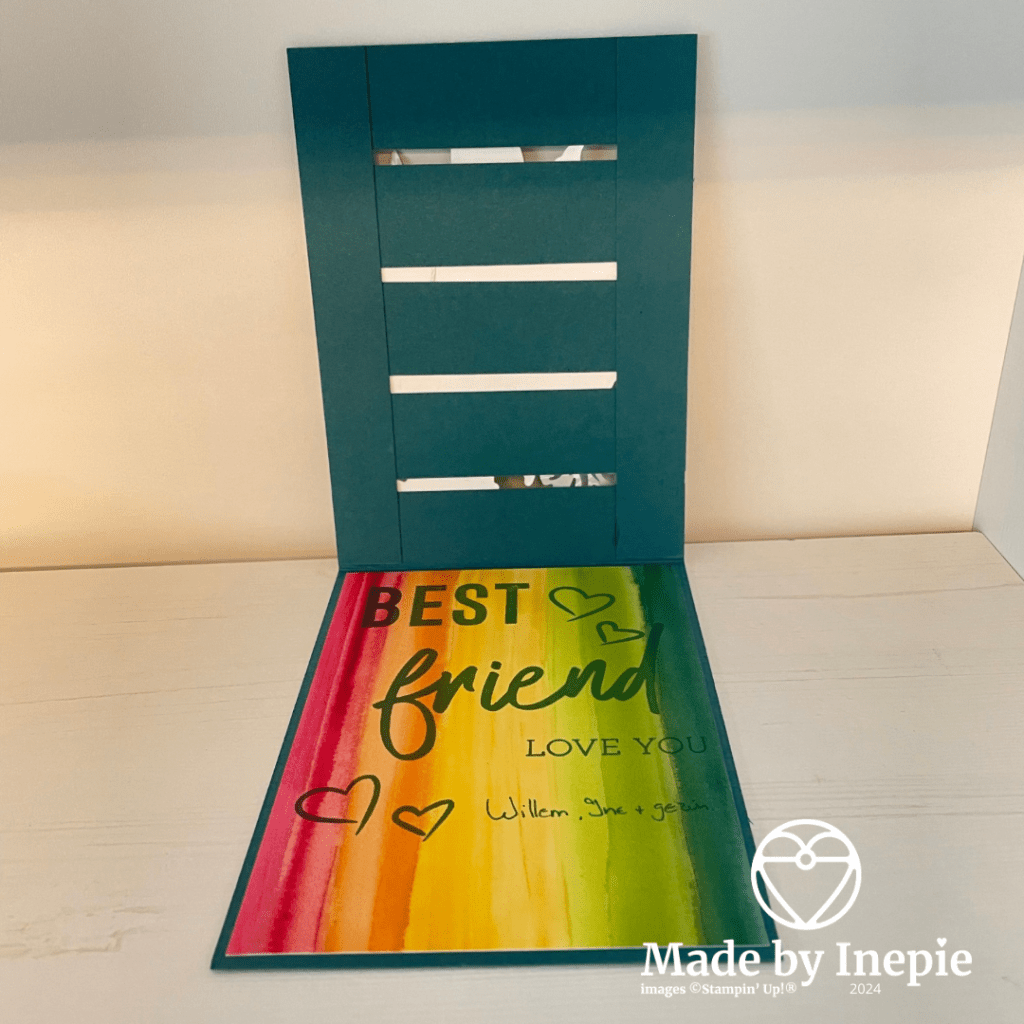 Hier zie je beter de stroken en ik heb er een mooi stuk Full of life Dsp (163357) ingeplakt. En deze bestempeld met de Friends For Life stempel set (163359).