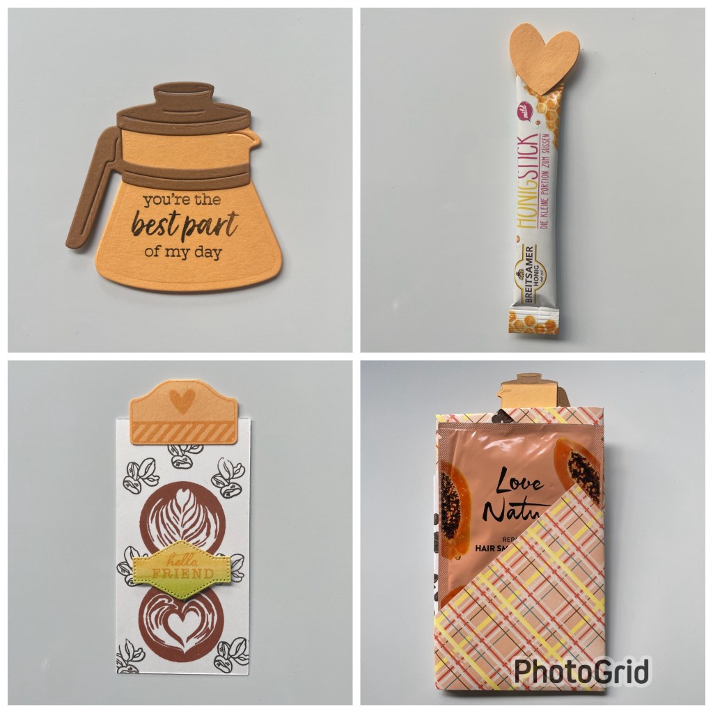 Ik maakte met twee koffiepotjes op elkaar een soort Paperclip. Een honing stick ( ze drinkt ook thee) versierde ik met een hartje. Ik maakte een leuk label en achterin stopte ik een fijn Haarmasker van Oriflame.