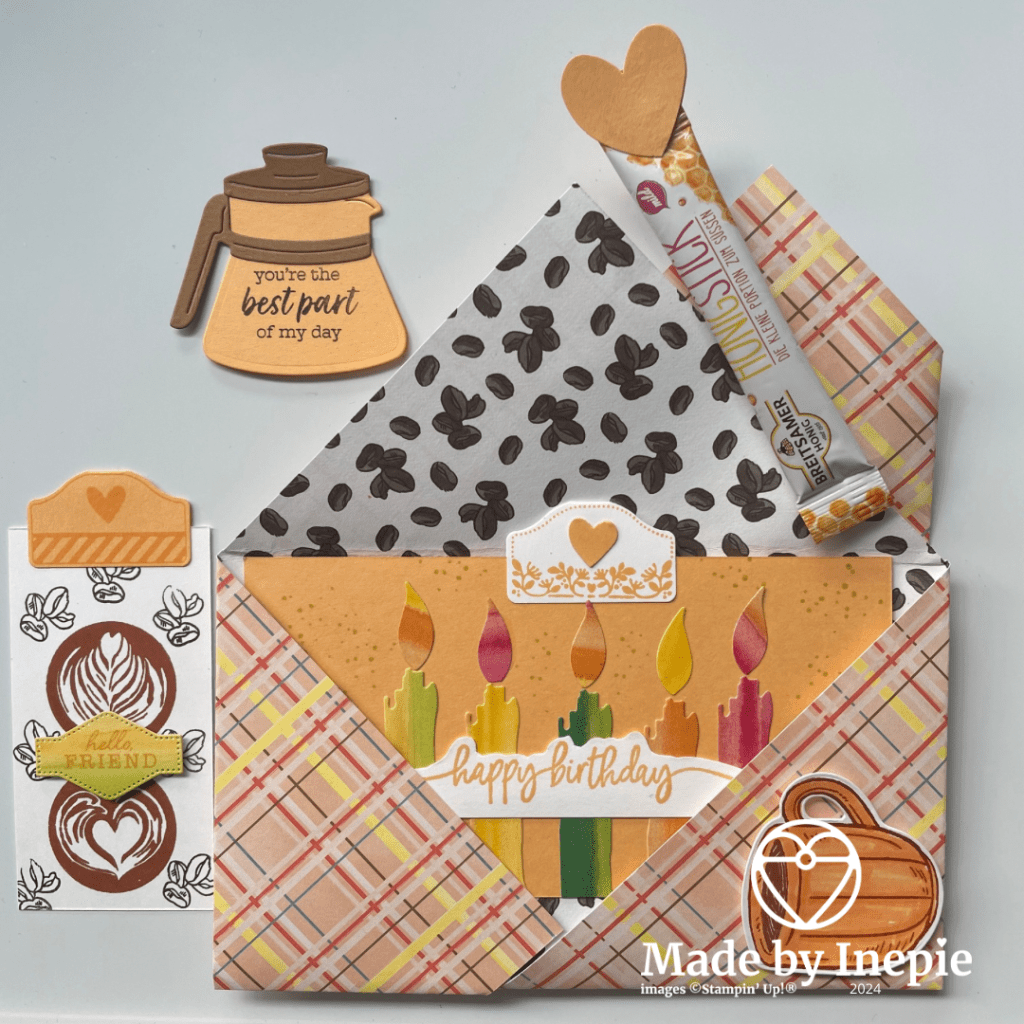 Ik heb gewerkt met het A Little Latte Dsp: daar heb ik de envelop mee gevouwen. En daarna de Latte Love bundel gebruikt voor de aankleding. Zo leuk om te doen.