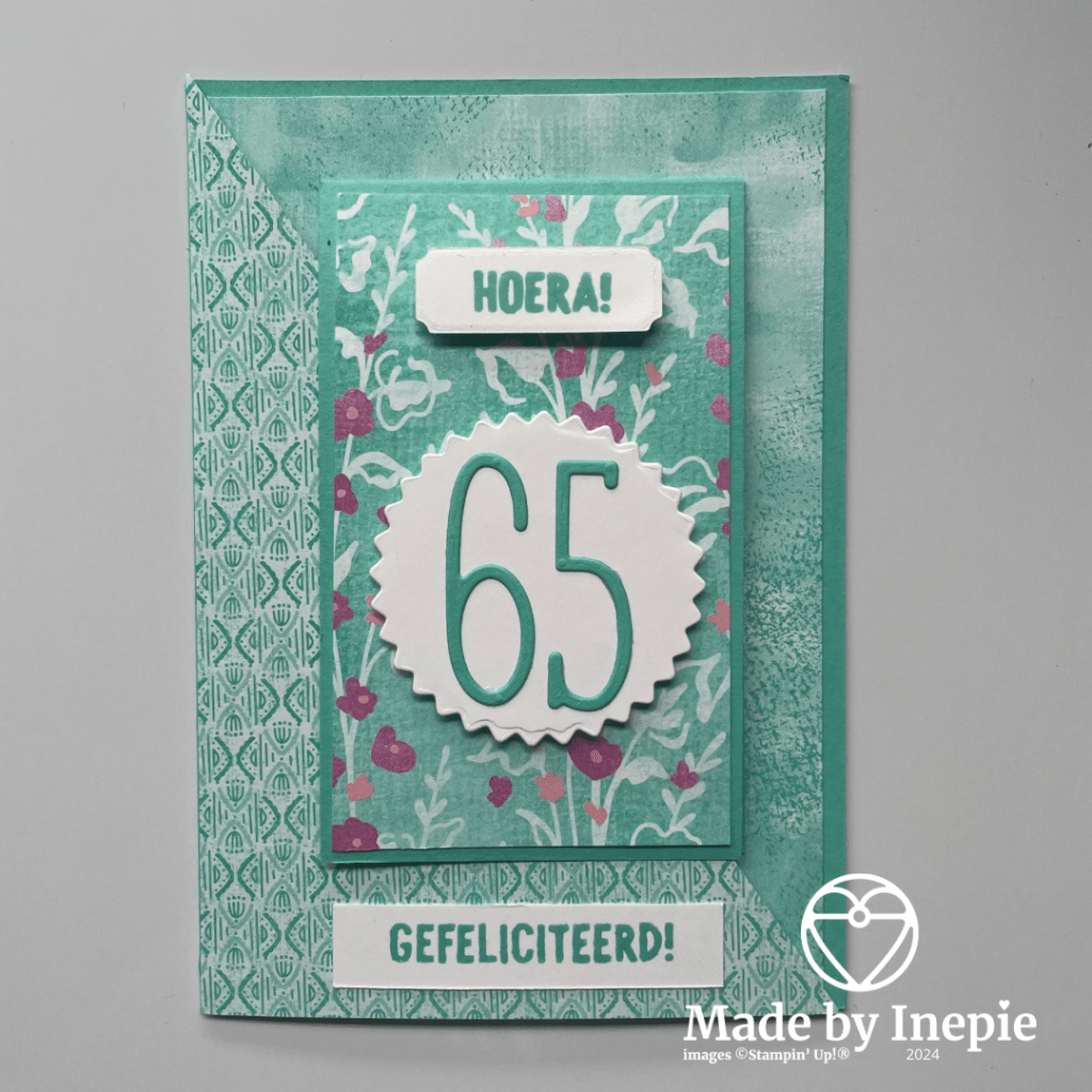 Een tijdje terug kreeg ik de opdracht om een kaart te maken voor 2 personen ( een echtpaar) die 65 waren geworden. Dit kaartje heb ik hier nog niet kunnen showen maar nu is het feest geweest en kan ik hem hier tonen.