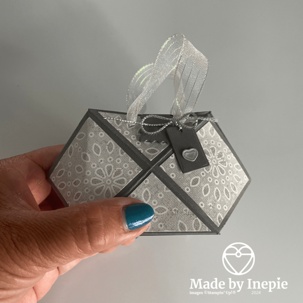 Door het gebruik van Basic Gray cardstock en het Country Lace Dsp wordt het een chic tasje. Het kleine zilveren hartje maakt het helemaal af. Het sluit met een magneetje.
