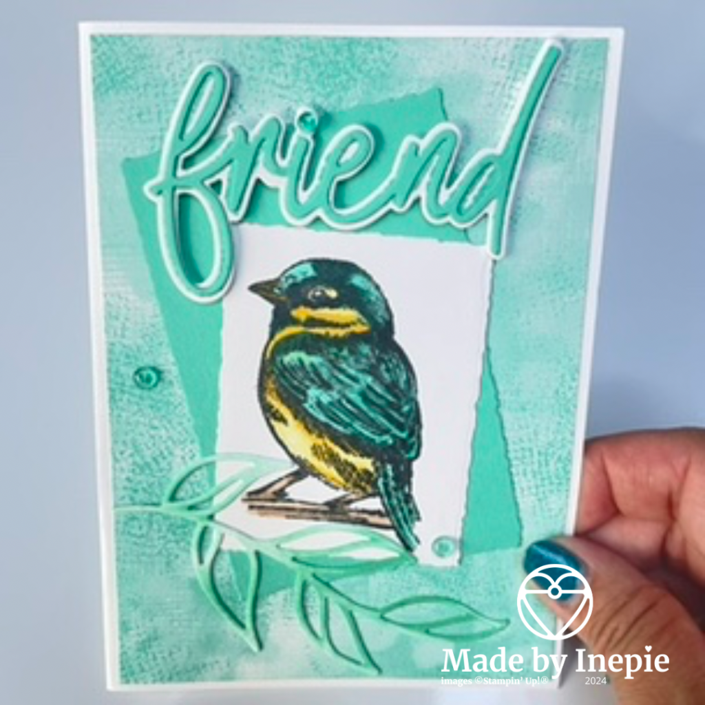 Ik heb een Basic White basiskaart gemaakt met een mat van Dsp. Hierop een stuk Summer Splash cardstock uitgestanst met de Deckled Rectangles. Het vogeltje ook uitgestanst met een kleinere Deckled Rectangle en een beetje schuin op elkaar geplakt.