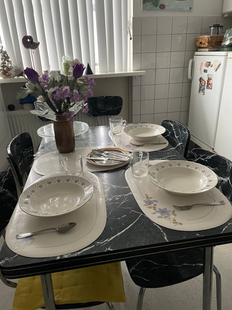 Deze flinke bak met Spaghetti heb ik voor ons en ons mam gemaakt. Recht vanaf het vuur in twee bakken gedaan want Nick moet ook eten. Ik doe het dan in een koeltas en dan is het zelfs na de trein en auto reis warm. En kunnen we direct aan tafel. Want ons mam had de tafel alweer netjes voor ons gedekt.
