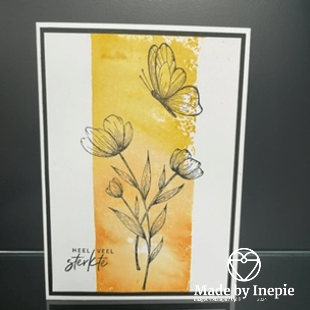 Ik heb twee kleuren inkt op een clear block gedaan en daar water opgespoten en het toen op de Basic White mat gedrukt. De mooie bloemen en vlinder heb ik met Stazon gestempeld want dat is een diepere zwarte kleur.