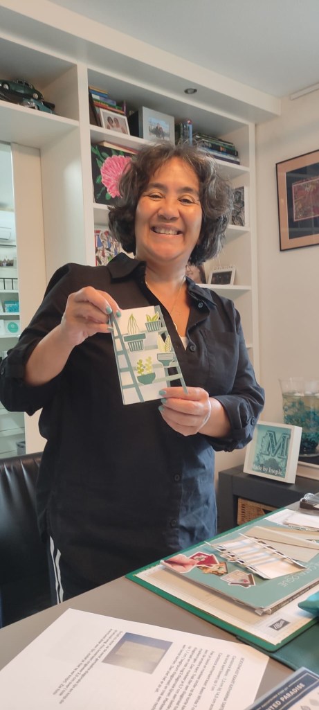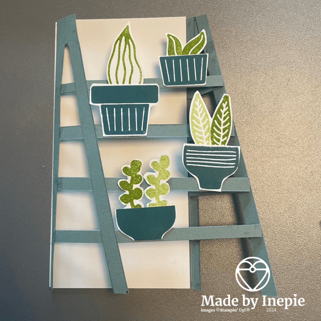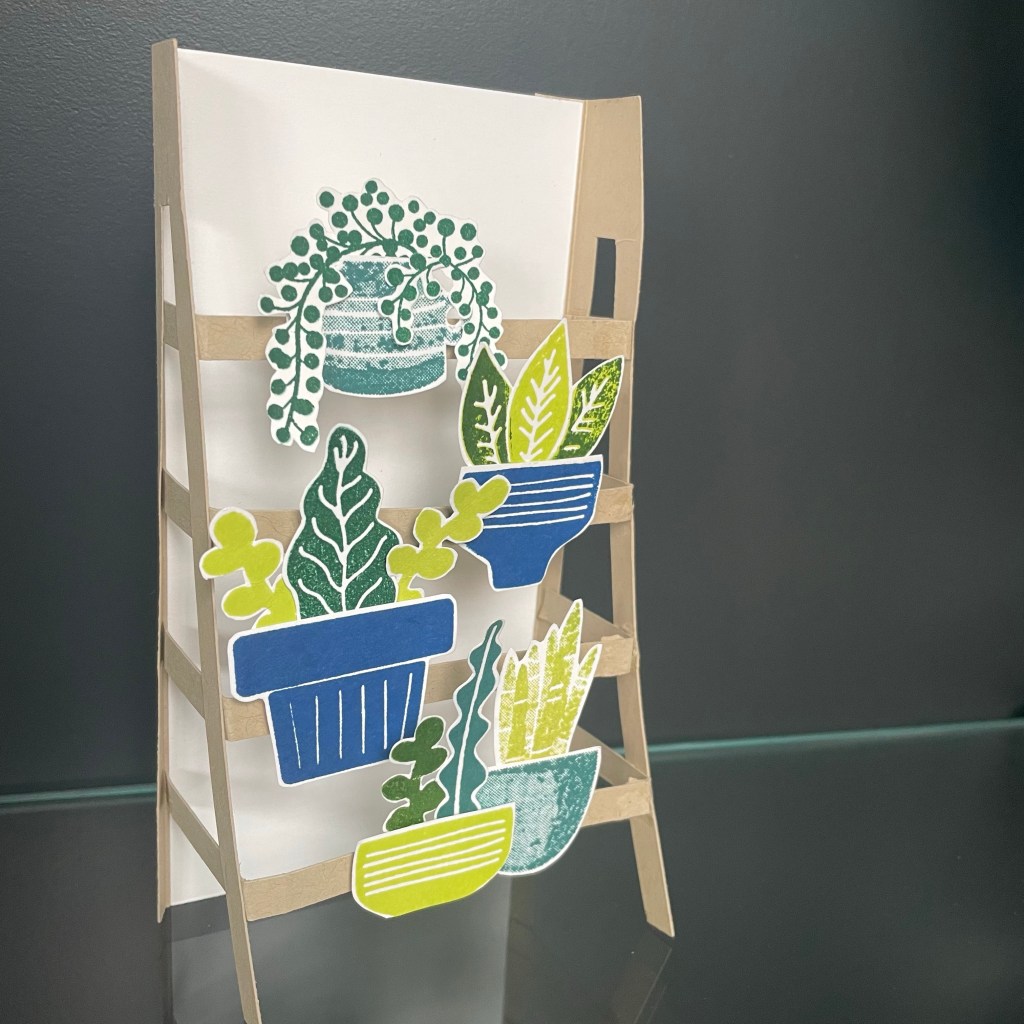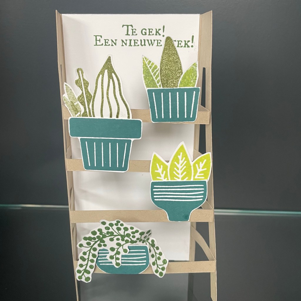 Ik had dit leuke plantenrek kaartje voorbereid die ik gezien had op Instagram bij Katharina Tarta. Voor de lunch hadden we het rek klaar en na de lunch hebben we de rekjes versierd met planten. Ik had de set Planted Paradise nog nooit gebruikt en vond dit het ideale project daarvoor. En ook de retired set Plantenpost.