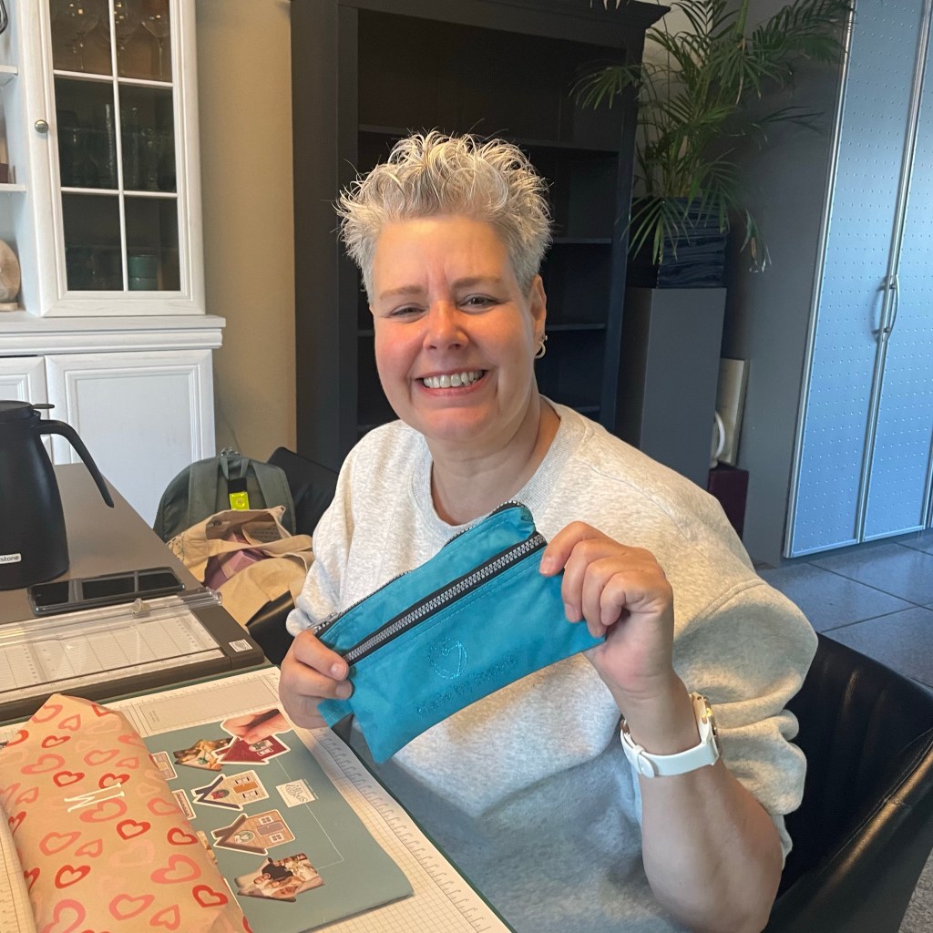 Een echte Madebyinepie etuitje in natuurlijk mijn favoriete kleur. Een bonefolder van Stampin’up! met hun naam erop, een leuk gehaakt tulpje sleutelhanger en een tassenhanger.