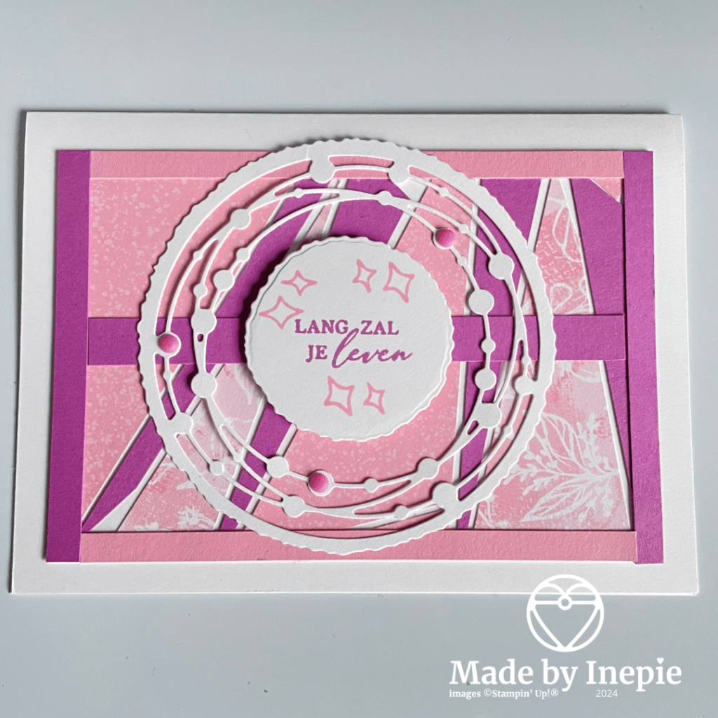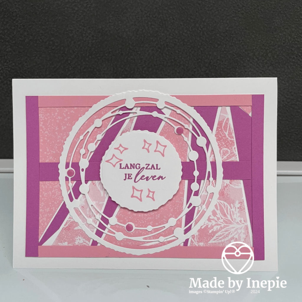 Ik heb gewoon stukjes gesneden met mijn Papertrimmer en die in elkaar gepuzzeld. En ik hou altijd reepjes cardstock over die ik als omlijsting heb gebruikt. Daarna met de Irresistible Bloom Stansen de leuke cirkel gemaakt en deze uitgestanst met een grote Deckled Circle stans. En een kleine Deckled Circle voor de tekst. De Irresistible Bloom bundel is alleen online verkrijgbaar.
