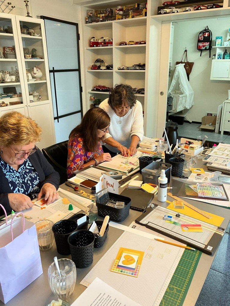 Wat ook erg leuk was, was de extra Koffie en Kaart die ik vrijdag had. 1 Vriendin had 3 andere vriendinnen uitgenodigd om ook een keer een kaartje bij mij te maken. Helaas viel 1 dame af maar met ons vieren hadden we een leuk klein groepje waarin ik de twee nieuwe dames kennis liet maken met deze mooie hobby. Het was supergezellig en er zijn hele mooie kaarten gemaakt. En ook hier speelde kleur een belangrijke rol. Want de kracht van Stampin’up! is dat al onze kleuren perfect bij elkaar passen: de inkt, het papier, de versieringen en de lintjes. De Stampin’Blends en de Stampin’ Write Markers. En ons mooie Dsp heeft zoveel mooie kleuren daar wordt je gewoon blij van.