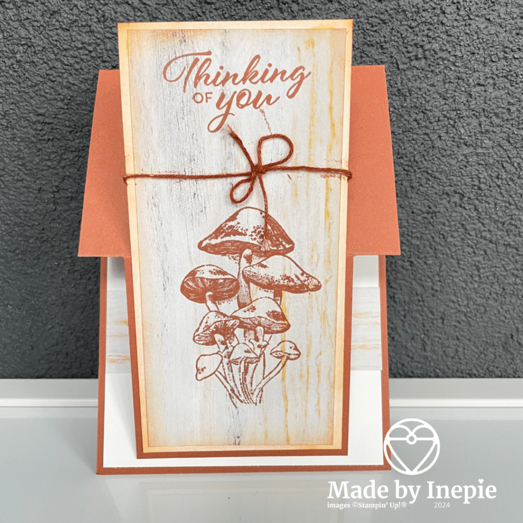 Ik gebruikte de mooie stempelset: Inspirational Sketches (162684) en deze keer de paddenstoelen. Het achtergrond papier is uit Country Woods Dsp(163393). Zo’n mooi veelzijdig te gebruiken Fun Fold kaart. Uit 1 A 4 haal je 2 basiskaarten.