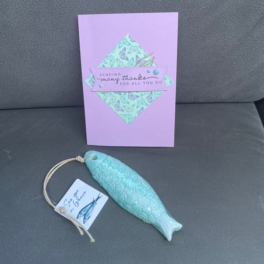 En toen we thuiskwamen lag er dit mooie cadeautje en mooie kaart met lieve woorden op mij te wachten. Van mijn lieve vriendin op afstand Netty. Ze was op vakantie in Kreta en zag dit zeepvisje hangen en moest meteen aan mij denken: daar kreeg ik wateroogjes van, zo lief!