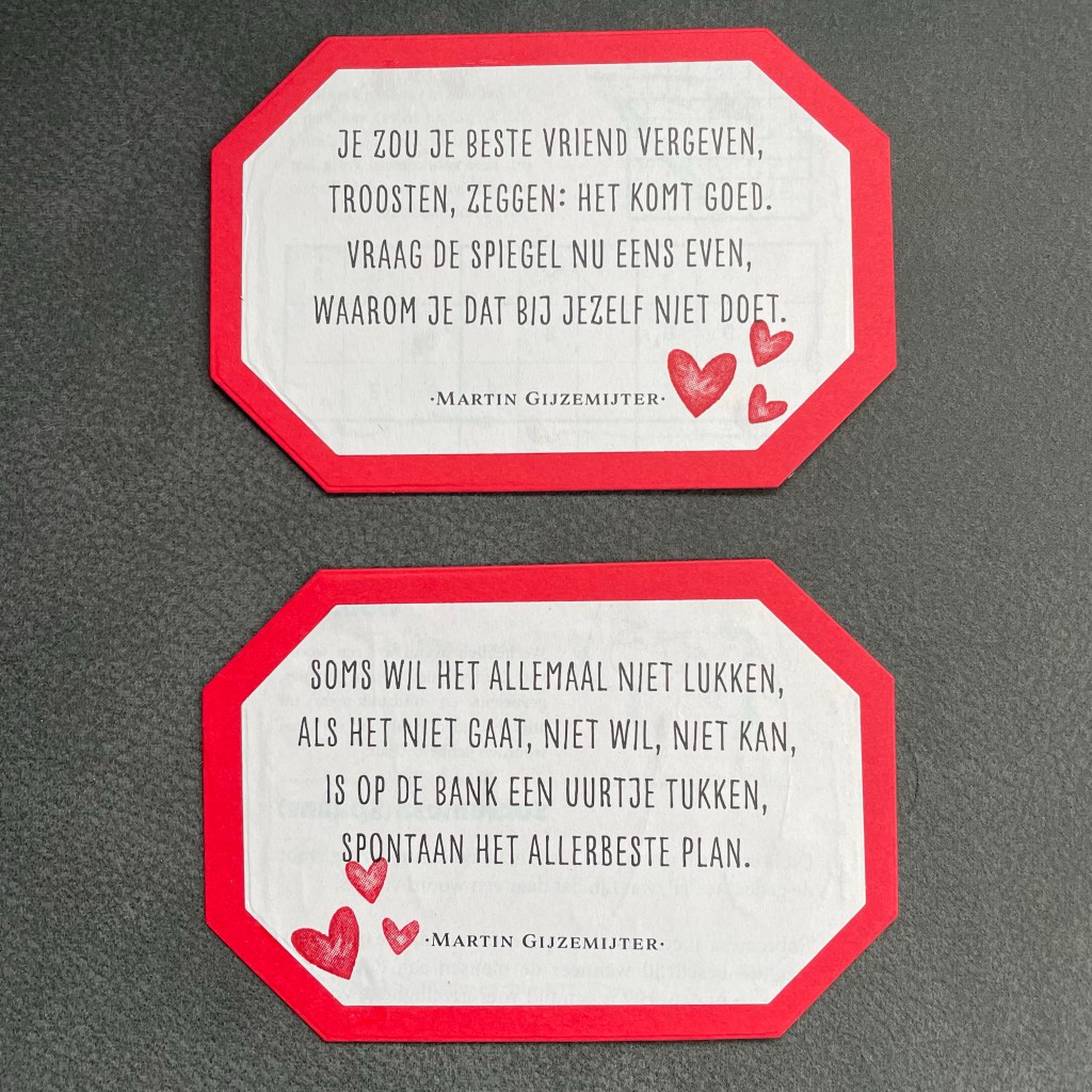 Jullie weten dat ik een enorme fan ben van Martin Gijzemijter. Met zijn dagelijkse gedichten weer hij mij altijd te raken. Soms grappig, soms een hart onder de riem, soms een schop onder mijn kont. Al jaren koop ik zijn scheurkalender en ik heb deze ook al vaak als cadeautje weggegeven. Ik lees zijn boeken serie: De Notaris. Kortom een echte fan. Van de week nog een vriendin blij gemaakt door twee teksten van de scheurkalender uit te stansen en op te plakken: zo recycle en deel ik.