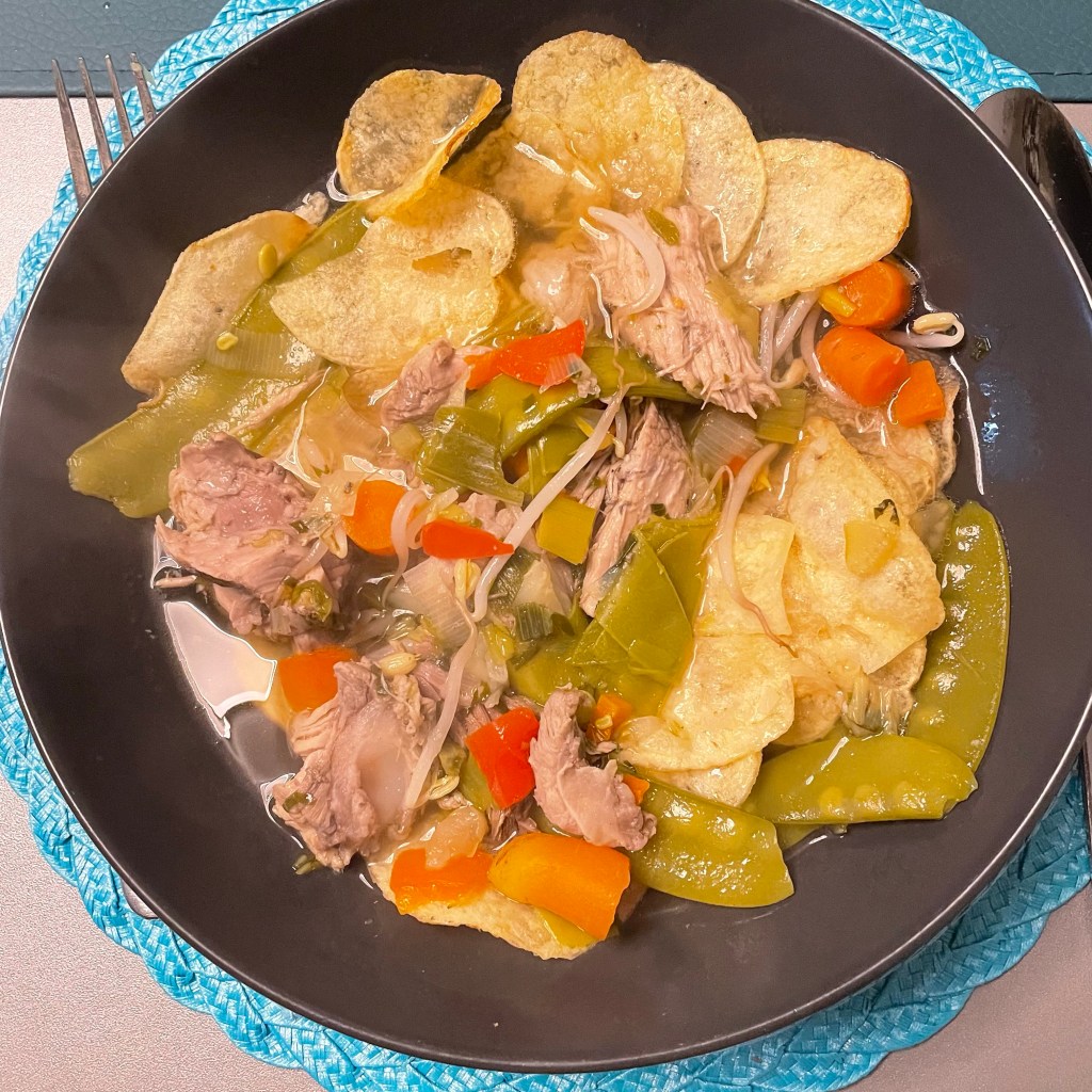 Vanavond lekker Indische Stoof gegeten. Een groentesoep gemaakt met krabbetjes/platte ribben. En ja jullie zien het goed dat eet je met chips. Gewone of paprika net wat jij lekker vindt. Ooit gegeten of van gehoord? Normaal laat ik de krabbetjes uren in een grote soeppan trekken maar ik mocht naar de massage dus heb ik ze vier uur op high in de slowcooker gedaan. Ze waren toen nog niet helemaal van het bot afgevallen dus nog een uur op het vuur gedaan. Willem vindt dit zo lekker en had al een paar keer gevraagd wanneer maak je dat weer. Ze waren nu in de aanbieding bij de Nettorama dus vandaag stond het op het menu. Troosteten met dit weer. Gisteren al andijviestamppot gegeten. Ik hou ervan, en jullie?