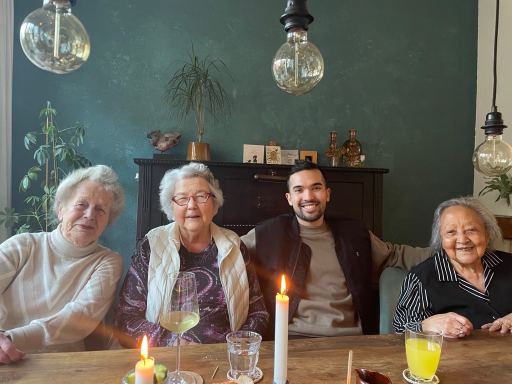 Vandaag vierden we de verjaardag van Dennis en Michael samen in Tilburg. Ons mam hebben wij opgehaald en meegenomen. De andere twee oma’s van Maartje waren er ook. Van links naar rechts: oma van 88 jaar , oma over een week 95 jaar, onze Dennis van 28 jaar en ons mam van 96,5 jaar. Wat een leeftijden en zo mooi dat de oma van bijna 95 jaar tegen mijn moeder zei: tot volgend jaar!