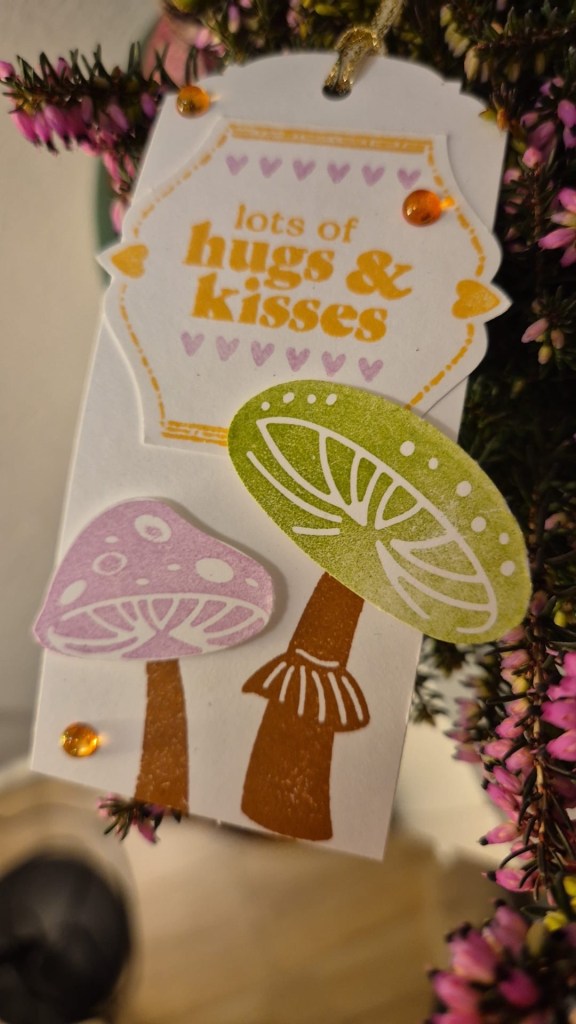 We hadden een mooie planten schaal gekocht eigenlijk voor in de serre maar Wilma vond hem zo mooi dat ze het binnen neerzette. Ik had dit leuke label gemaakt met de Paddestoelen bundel die zo populair is dat hij momenteel niet verkrijgbaar is.