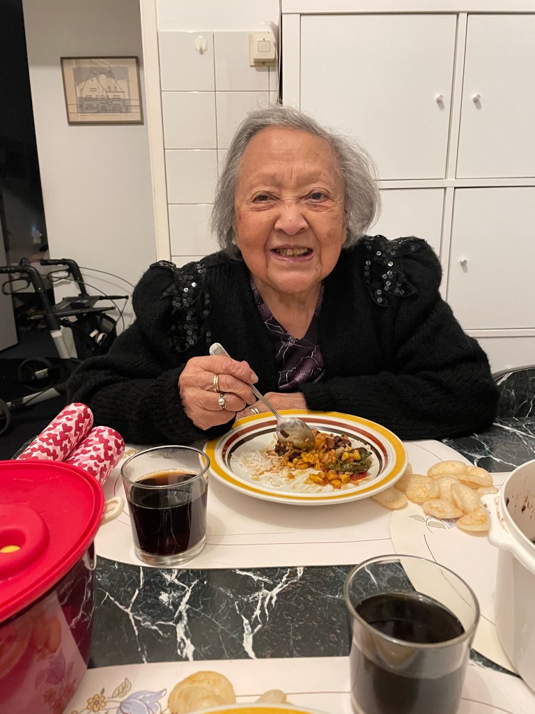 Vanavond bij ons mam geweest en lang leve de antibiotica! Ze zag er goed uit en smulde van de door mij gemaakte Babi Ketjap. Alsof de twee voorbijgaande weken een nare nachtmerrie zijn geweest. Een avond met een gouden randje!