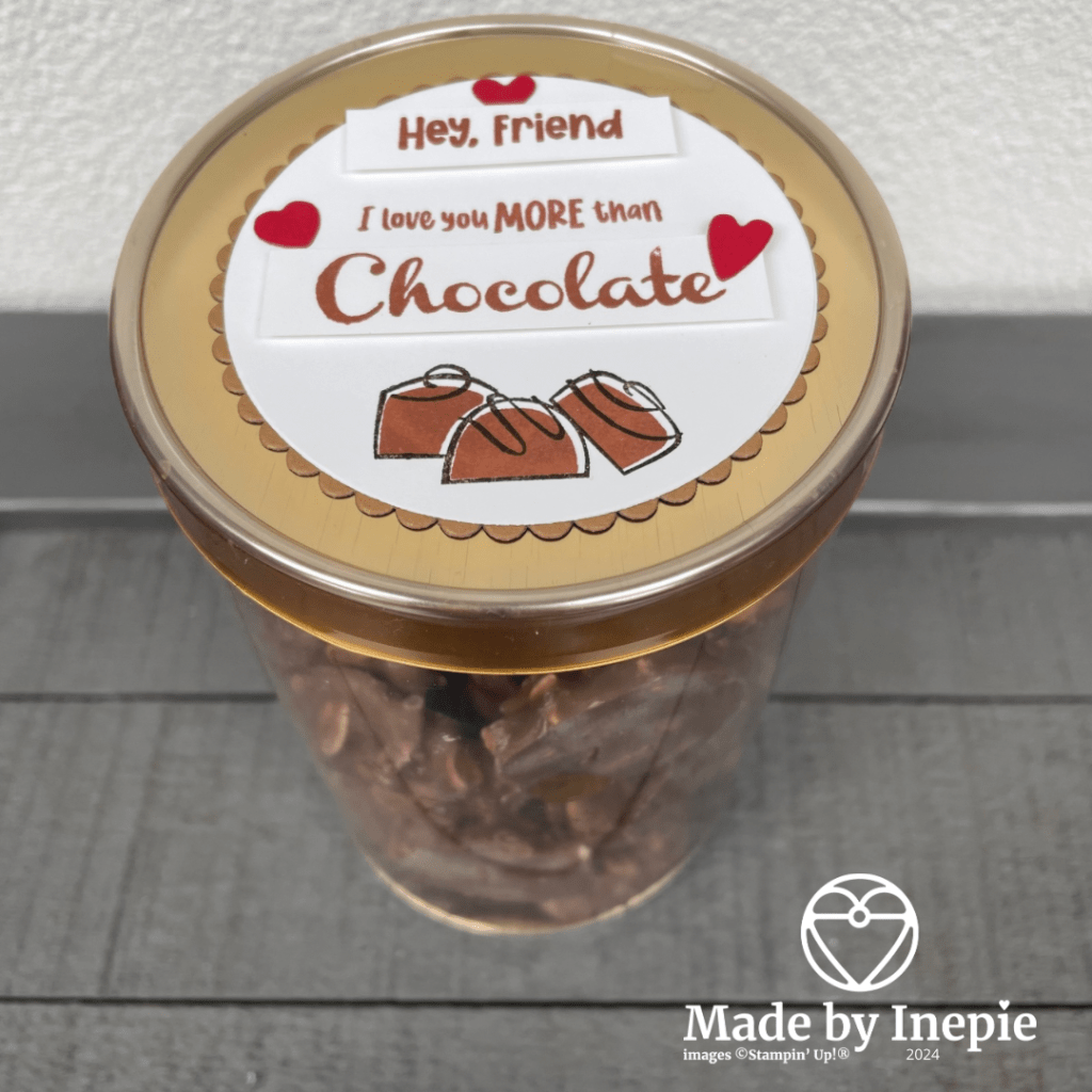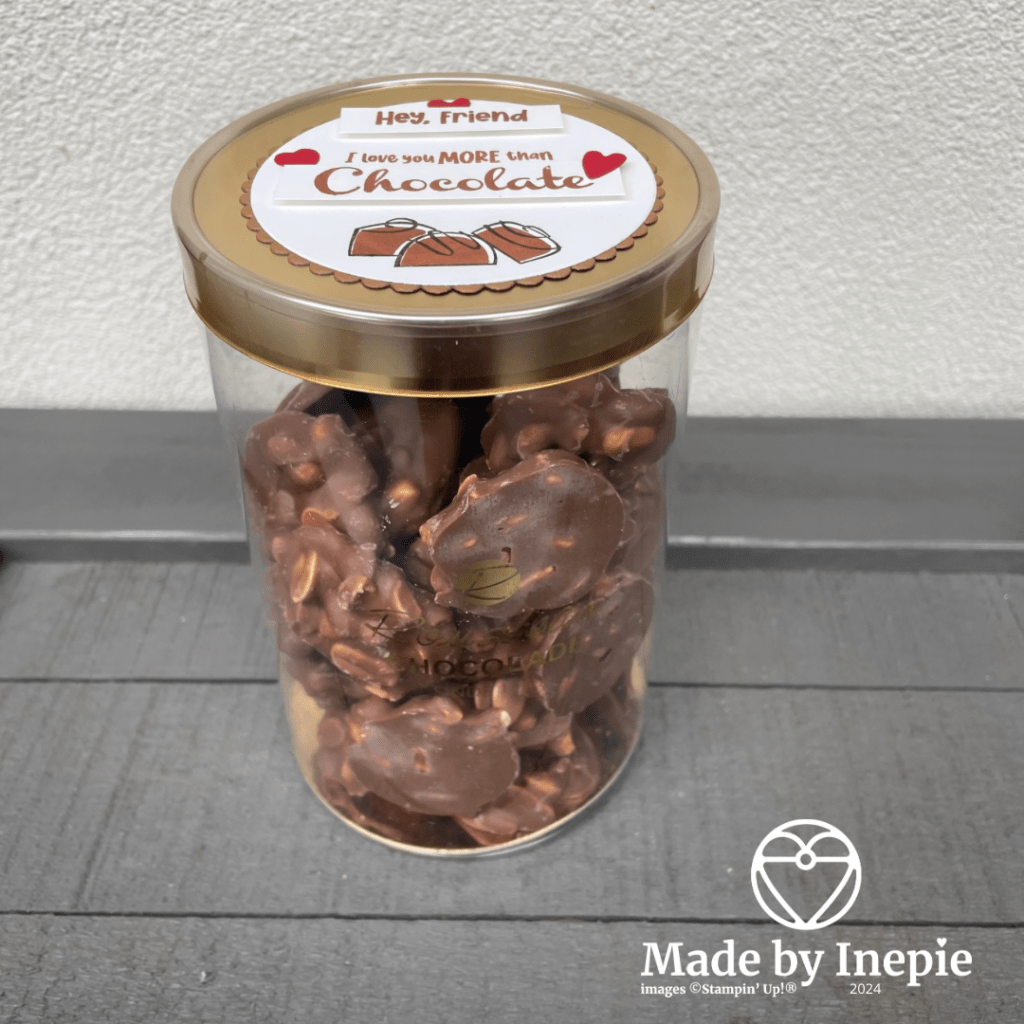 Ja jullie dachten misschien al: en kreeg Rudy niks. Natuurlijk wel. Ik weet wat Rudy super lekker vindt: pindarotsjes. En laat ik die nu ook super lekker vinden: zeker die van Rousseau hier uit Geldrop. De enige chocolade waar ik geen puistjes van krijg. Dus voor Rudy een bak van die lekkere pindarotsjes gekocht. Daar hoorde natuurlijk ook een label op. En deze heb ik gemaakt met een mengeling van oud en nieuw Stampin ‘Up! materiaal.