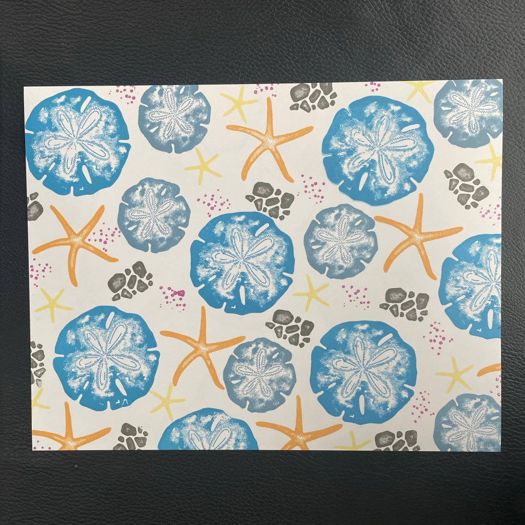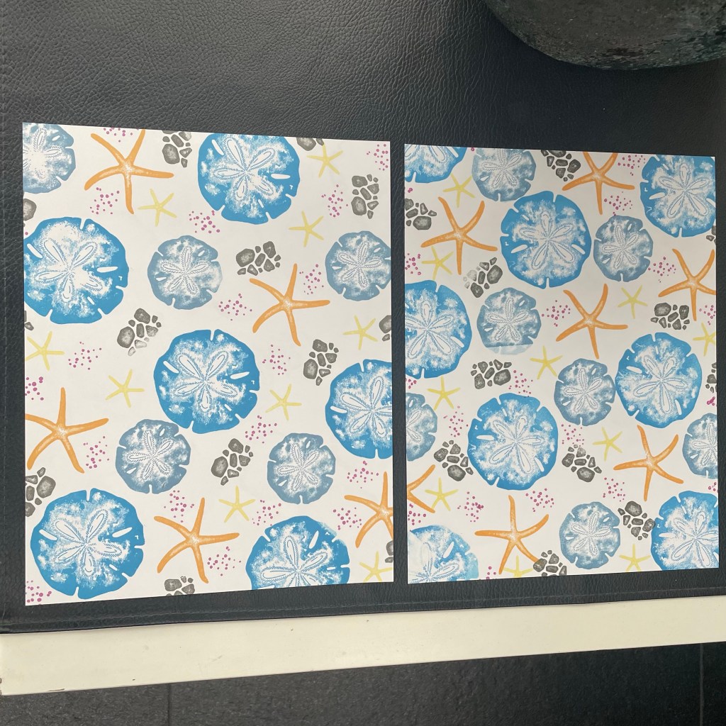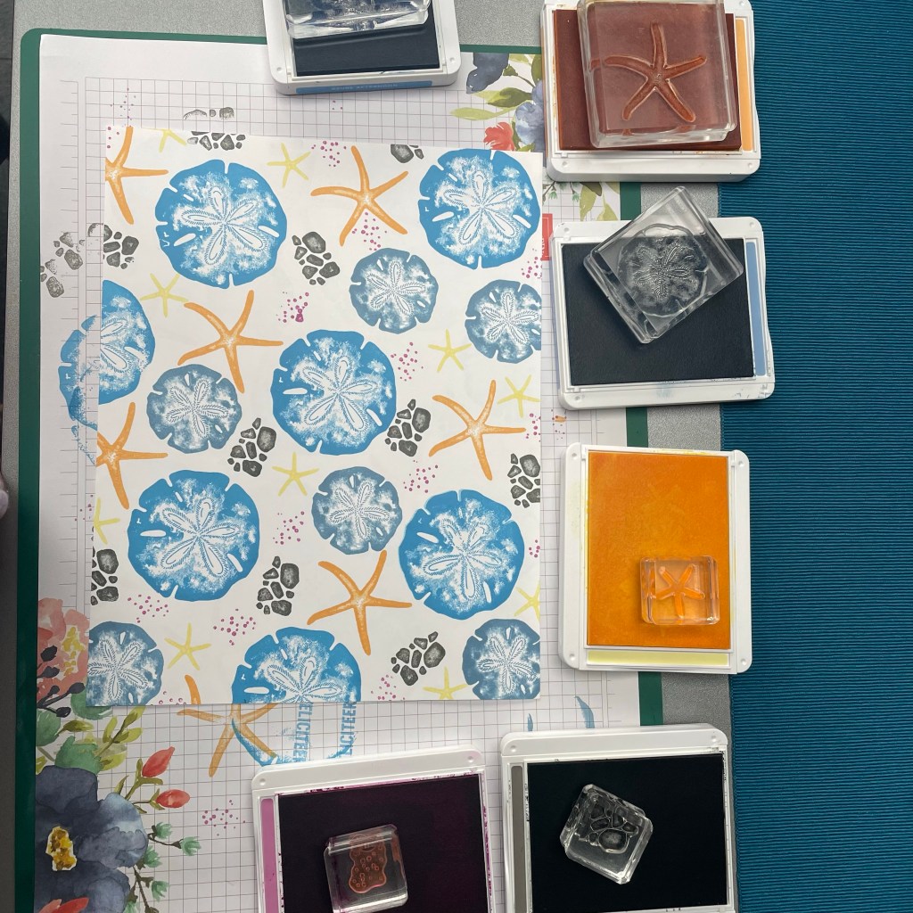 Je zoekt een paar kleuren inkt uit. Als ze in 1 kleuren familie zitten dan passen ze eigenlijk altijd bij elkaar. Je zoekt een stempelset uit en begint met de grootste stempel gewoon willekeurig te stempelen. Dan een middel grote stempel in een andere kleur en dan vul je de lege plekken op met kleinere stempels in verschillende kleuren. Vergeet vooral niet om aan de randen over de rand te stempelen dan lijkt het echt DSP.