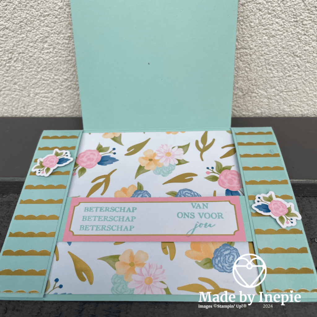Vandaag waren er 7 dames. Eigenlijk 8 maar 1 dame had haar novenarm gebroken dus die moest afzeggen. Toen ik gisteravond bezig was met de voorbeeldkaart besloot ik dan ook dat het een beterschaps kaart moest worden. En op de achterkant konden dan alle Koffie en kaart dames hun naam zetten. Zo gezegd, zo gedaan. Ik vind de kaart erg mooi geworden.