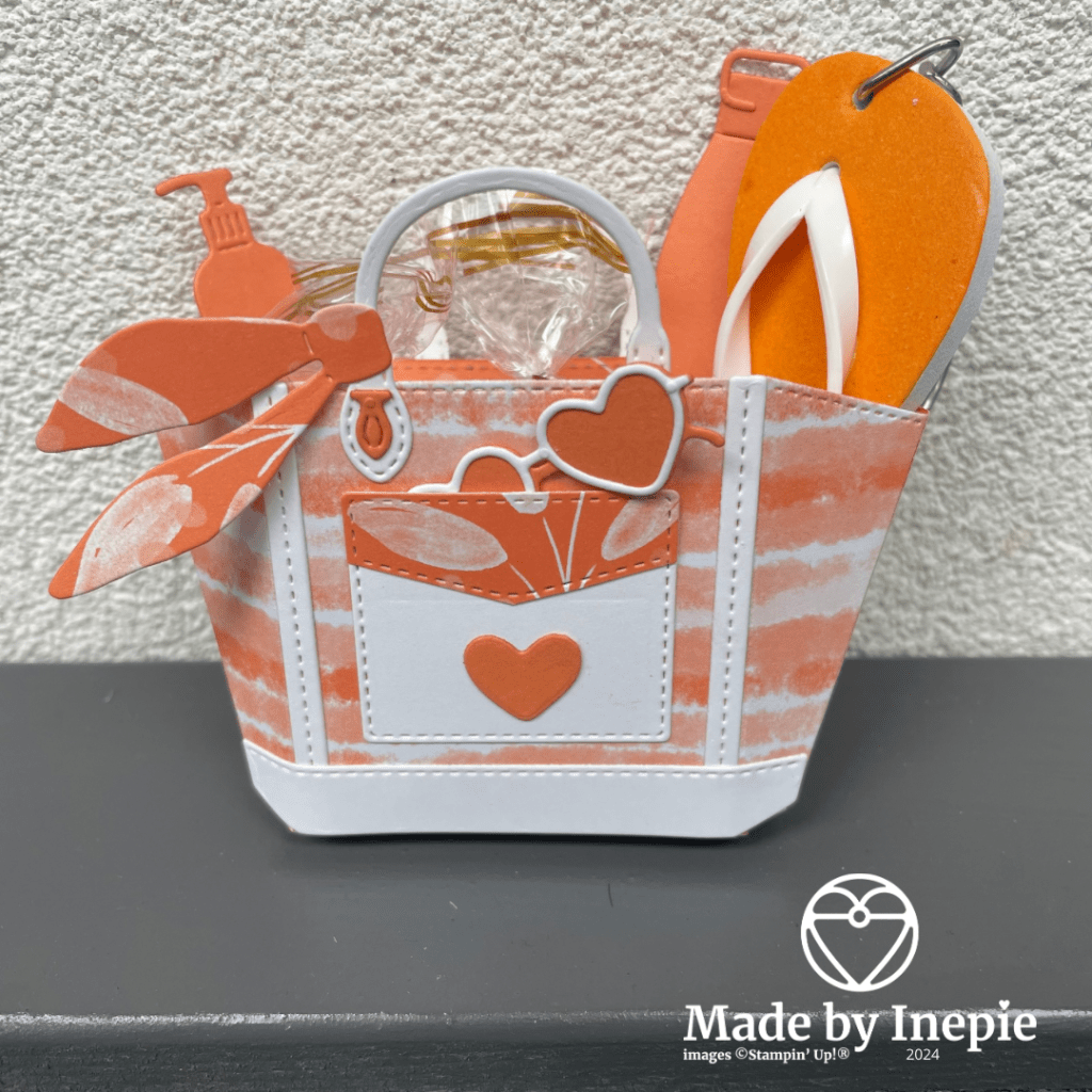 Ik had voor Linda dit leuke tasje gemaakt, erin zit chocola en een strandslipper sleutelhanger. Deze strandslipper kreeg ik van Netty mijn vriendin uit Leusden. Geweldig! Ze passen perfect in de tasjes. Ik heb de nieuwe Incolor Timid Tiger gebruikt.