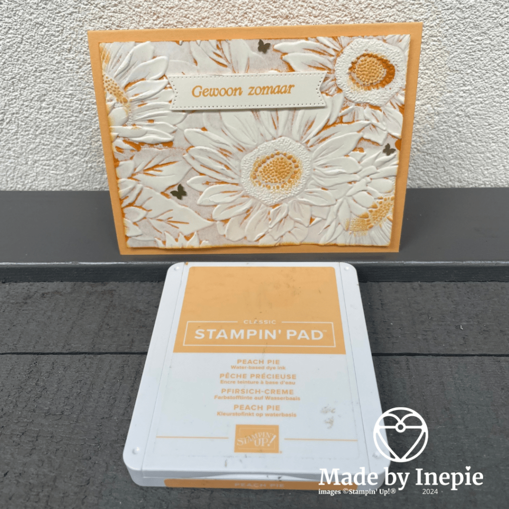Gelukkig had ik gisteren kunnen knutselen toen Willem bij de Brabantse Dag bezig was. En had ik deze kaart al af. Mooi he?! Very vanilla mat ge-embossed en toen met de inktpad er lichtjes overheen gegaan. Met een spongedauber wat kleuraccenten aan de harten van de bloemen gegeven. Met Dimensionals op de basis kaart van Peach Pie geplakt.