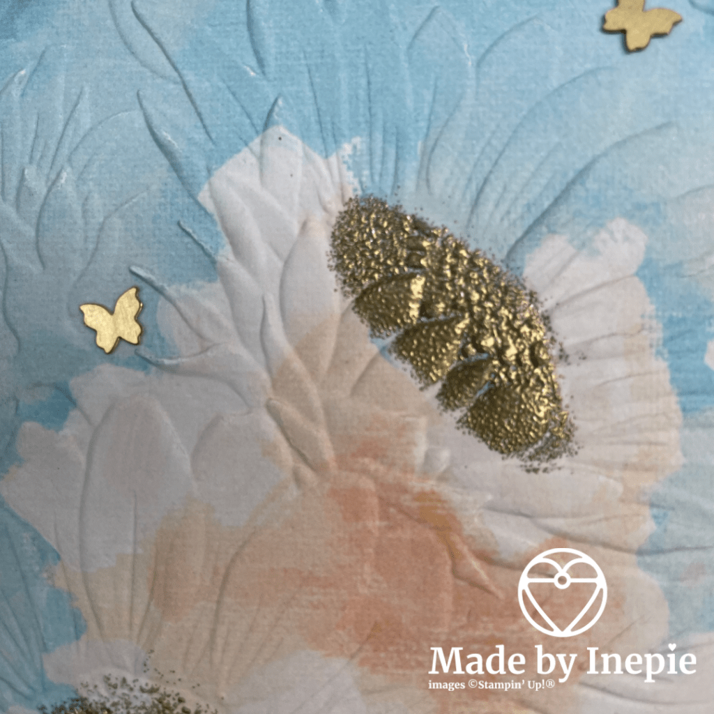 Ik heb met Versamark inkt en een spongedauber inkt aangebracht op de harten van de zonnebloem en daarna er goud embossing poeder overheen gestrooid. Wat teveel is of niet goed op zijn plek ligt, borstel ik weg met een kwastje. Daarna met de Heat Gun het poeder laten smelten en tadah: