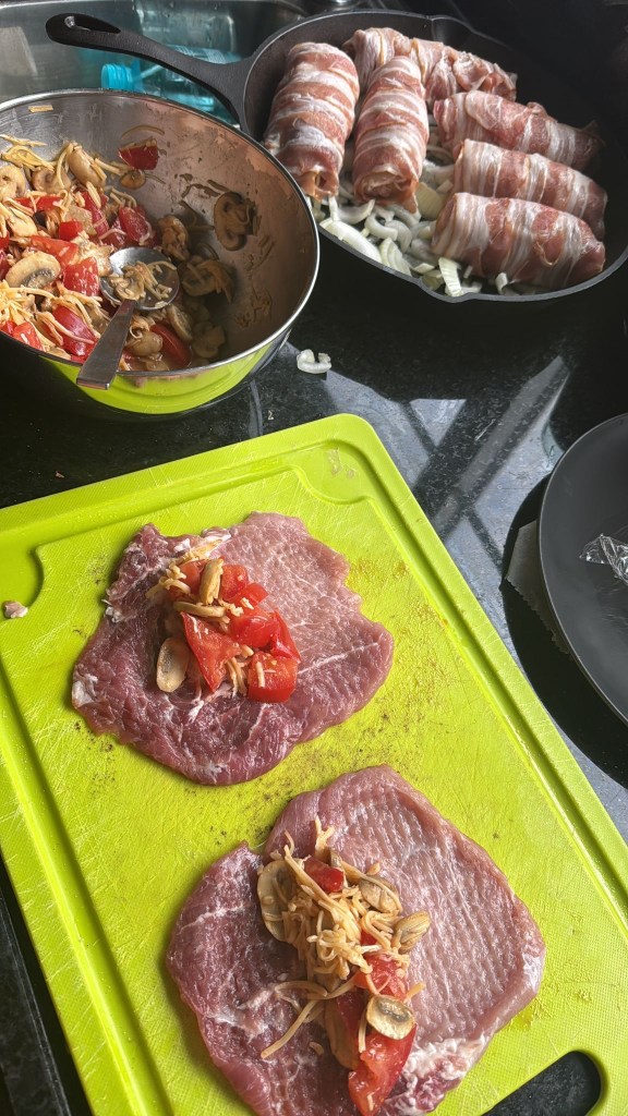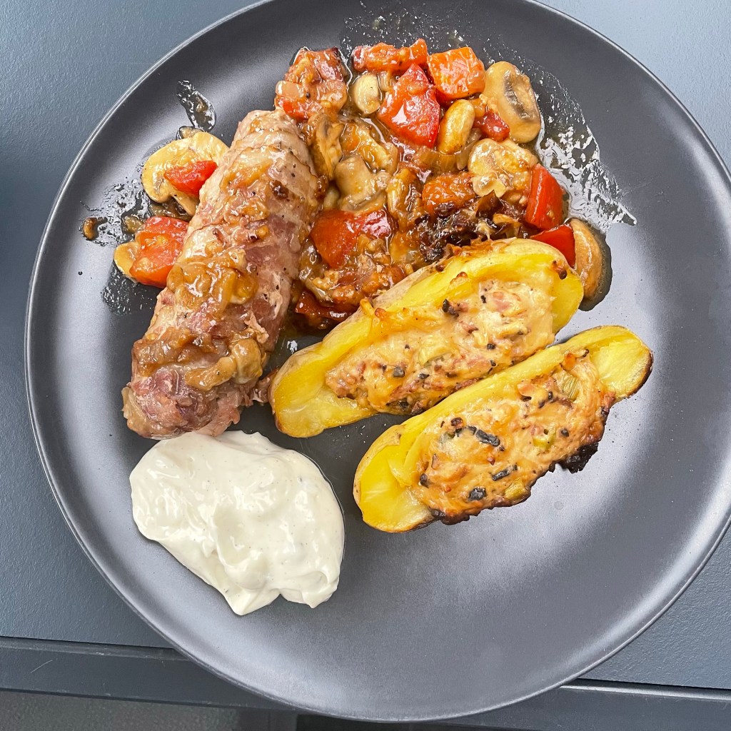 Gevulde Vleesrolletjes gerold in Bacon: lekker. Maar vandaag smaakte het nog beter. Want we hebben de vulling die over was er bij gedaan. En ook de gevulde aardappels die Willem gemaakt had houden we erin!