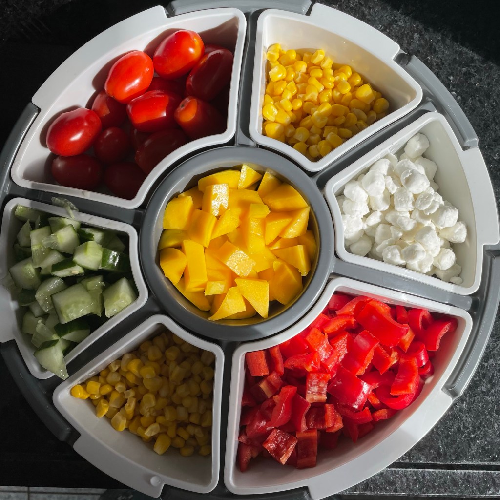S’middags hadden we al de voorbereidingen gedaan, eerst de boodschappen en toen samen in de keuken gestaan. Tegenwoordig doe ik vaak: build your own salad. Omdat we met zoveel personen zijn waarvan de 1 allergisch is voor tomaten en noten, een ander lust geen paprika, of kaas, etc. Dus snij ik van alles klein en heb ik bij de action deze fantastische bak gekocht: