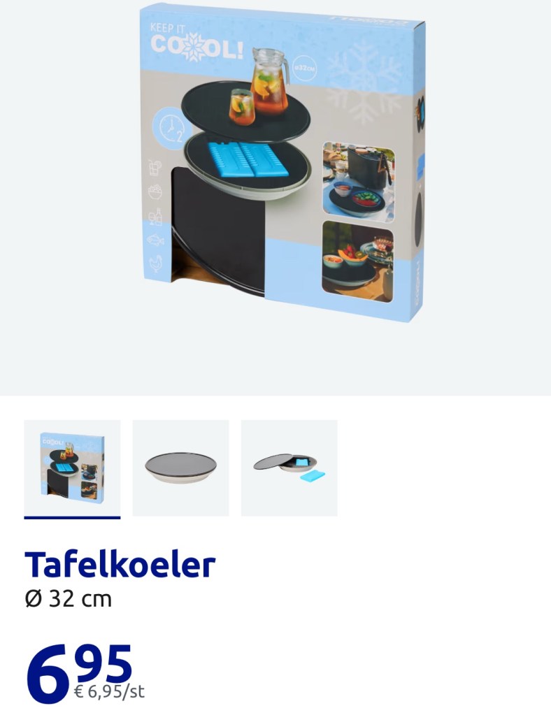 Zo kan iedereen zelf in zijn sla doen wat ze lekker vinden: ideaal! Bakken sla op tafel en wat dressings en klaar ben je. Bij de Action heb ik een ronde tafelkoeler gekocht die past precies onder de schaal. Er zitten twee koelelementen in en houd alles fantastisch koel en fris!