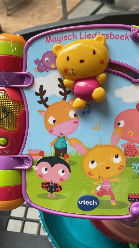 Ook voor ons Lynn was ik goed geslaagd: vier dingen van Vtech. Deze geven licht en geluid als je erop drukt en dat vindt ze nu helemaal leuk! Normaal best prijzig maar tweedehands goed te doen. Ik heb ze uit mogen testen( deden ze eerst wel moeilijk over) maar gelukkig had een jongeman begrip voor deze oma dat ik niet iets ga kopen wat het niet doet. Want terugbrengen mocht niet. En dan is iedere euro teveel. Ik grapte al tegen Mandy, zeg maar tegen Lynn dat oma’s speel-o-theek is uitgebreid.