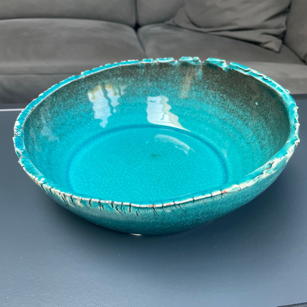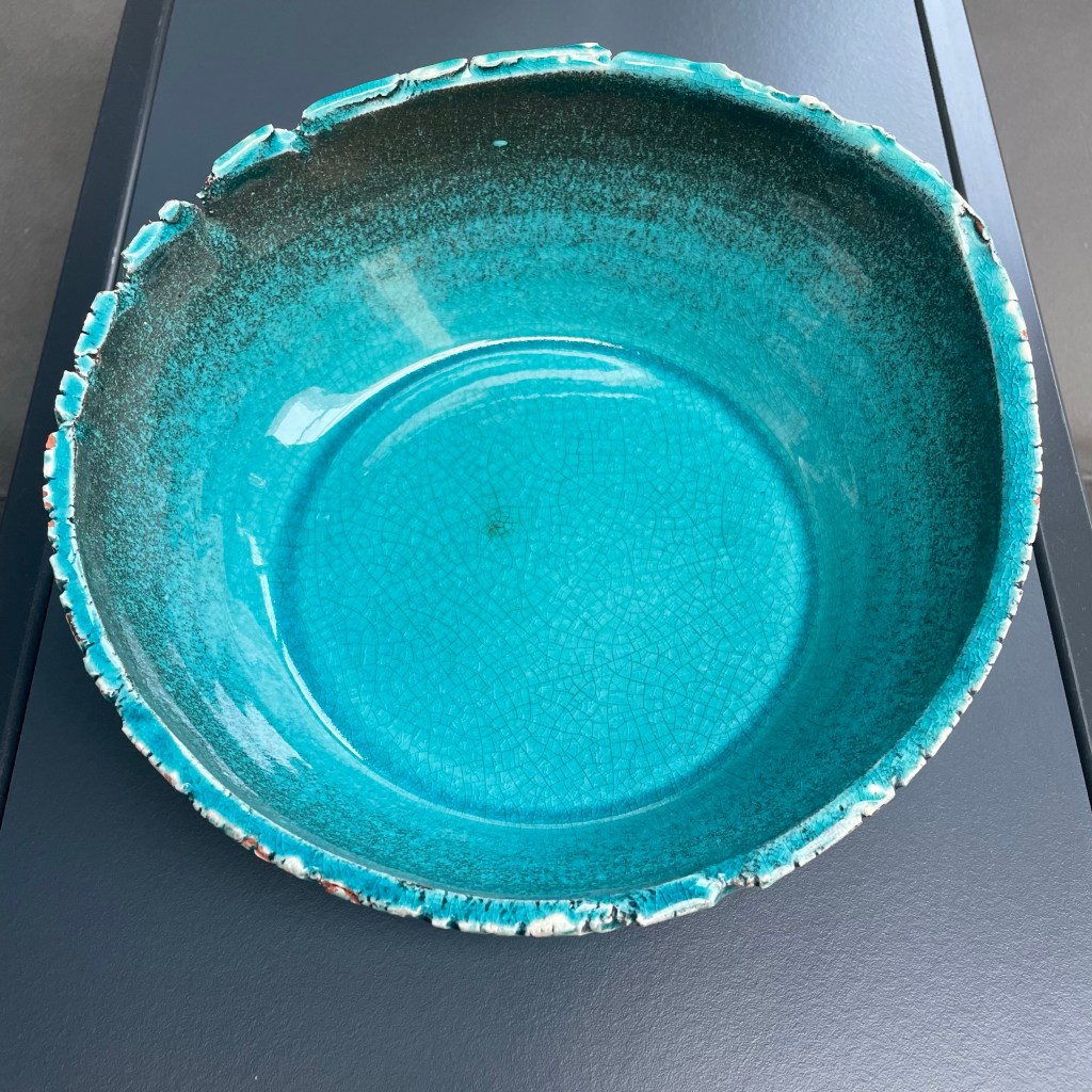 De schaal hierboven was echt een geluksmomentje. Precies mijn kleur! En ik vind de asymmetrische vorm ook erg leuk. Het is ooit door iemand gemaakt en staat nu bij mij thuis te pronken. Wie weer herkent iemand deze schaal: weet dan dat hij een goed leven bij mij krijgt.