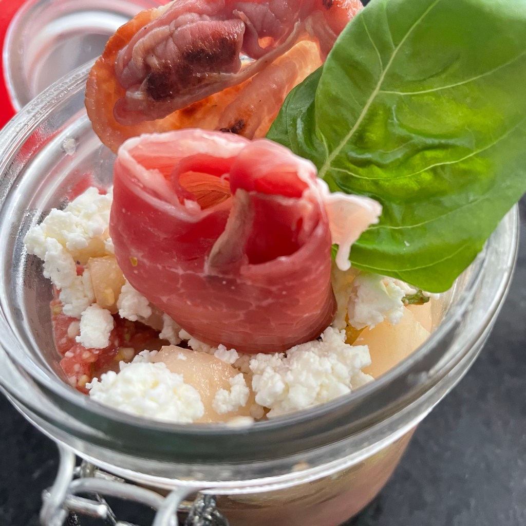 Dit is toch een plaatje?! We hadden als voorgerecht een combinatie van 3 meloenen: watermeloen/ Galia meloen en Cantaloup meloen. Erdoor pistachenoten en geroosterde pijnboompitten die ik gemalen had. Een dressing van honing, olijfolie en citroensap. Dit door elkaar gehusseld, daarboven op geraspte feta. En versierd met rauwe parmaham en geroosterde parmaham. Het lijkt toch bijna een roosje en het basilicum blaadje maakt het af. Trots op!