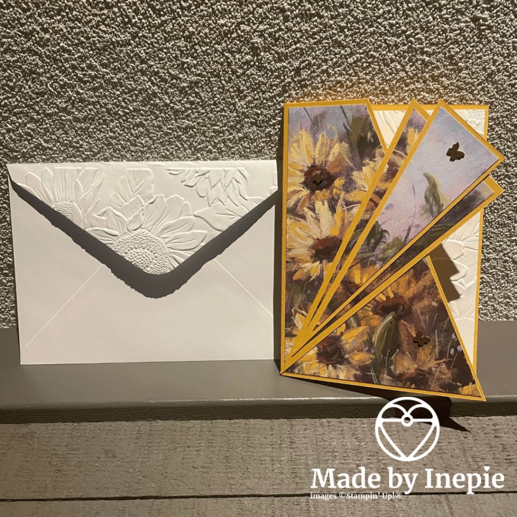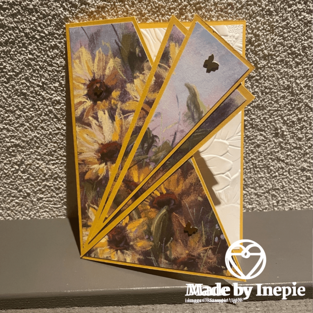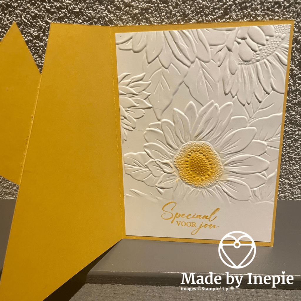 De binnenkant heb ik met de mooie zonnebloem embossing folder gemaakt. Met wat inkt het hart van de bloem kleur gegeven.