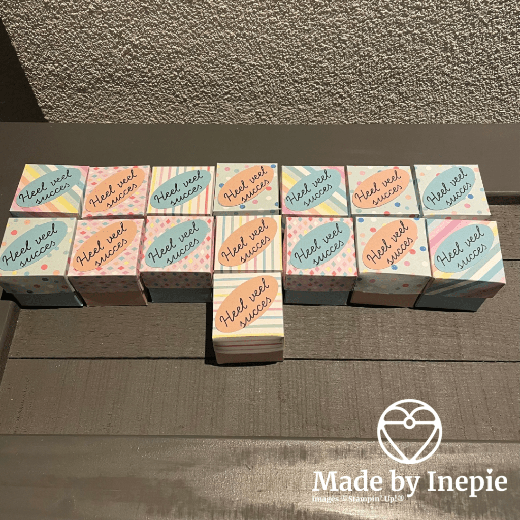 Van een lieve vriendin kreeg ik de opdracht om 15 doosjes te maken voor een hockey team. Er moest een Oriflame wonderpotje in kunnen. Dus ik gemeten en berekend en patroon gemaakt.