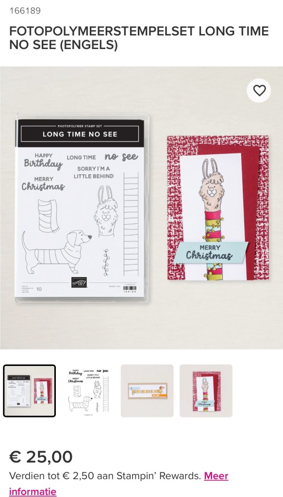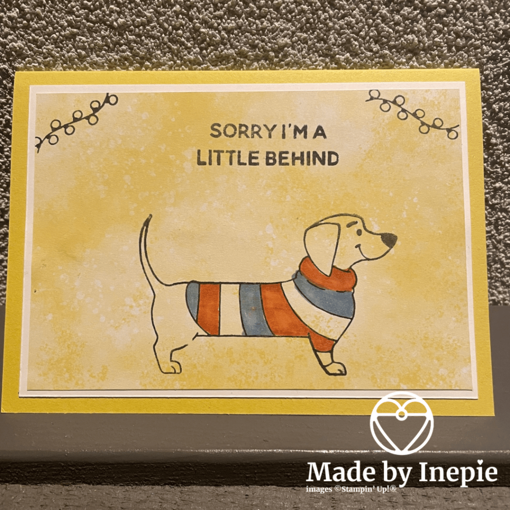 Hij lag al even op de plank maar het kwam er gewoon niet van om ermee te spelen. De leuke set Long Time No See. Ik heb het hondje gewoon rechtstreeks op Dsp gestempeld en daarna met de Stampin’ Blends ingekleurd. Toen deze op een Basic White mat geplakt en daarna op een Darling Duckling Basiskaart. Leuke kaart toch?!