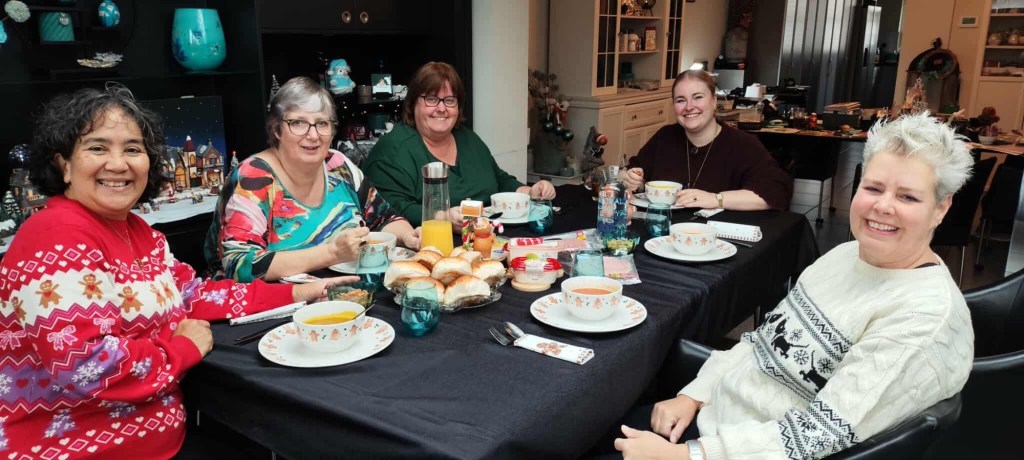 Dat vonden de dames die gisteren de eerste van vier Kerst en Kaart dagen aftrapten ook. Dit zijn mijn Stampin’Up! Vriendinnen die ik zonder onze gezamenlijke hobby/passie nooit ontmoet zou hebben. Let ook op de georganiseerde chaos op de tafel: werk in uitvoering! Mijn schoondochter Bibi was zo lief om te komen helpen, dus kon zij mooi de groepsfoto maken.
