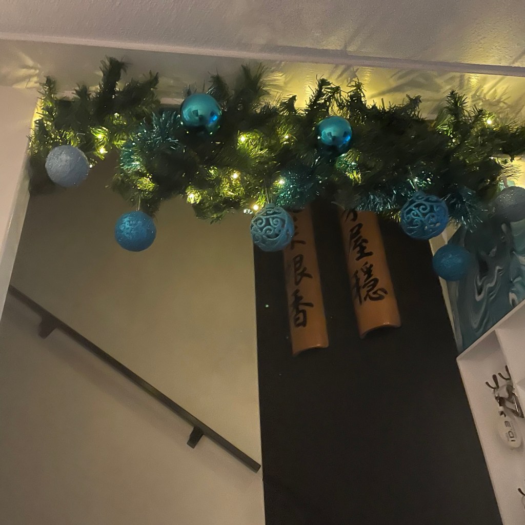 Zelfs onze trapopgang is versierd. Zagen een Action Hack op Instagram: douche stang voor nog geen 4 euro, guirlande met verlichting nog geen 8 euro en wat ballen: Tadah 😍.