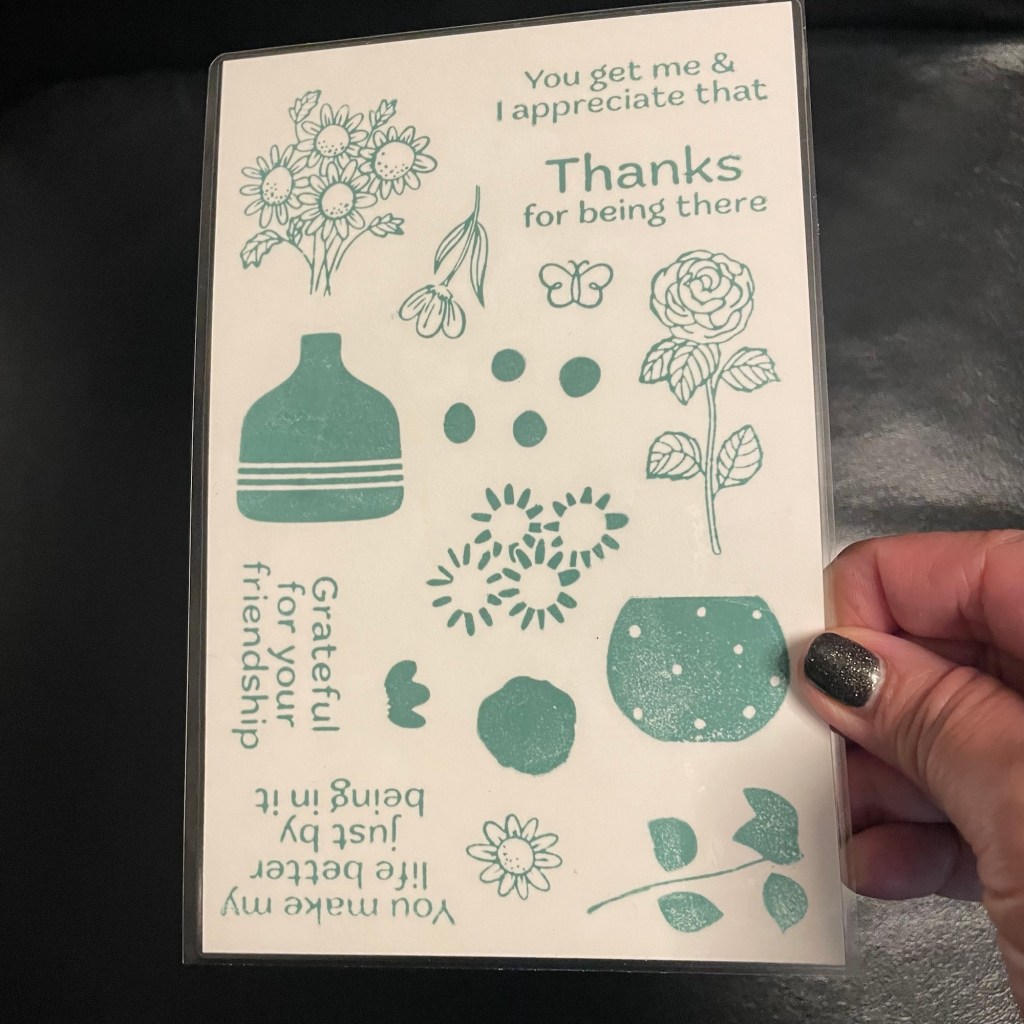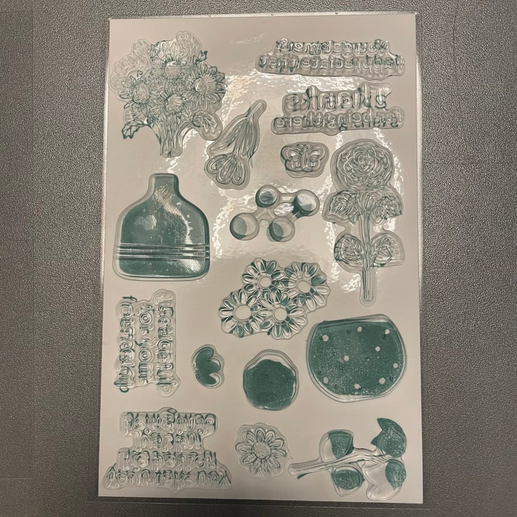 Deze bundel kreeg ik vandaag binnen en ik heb meteen bij de stempels het dunne plastic velletje eraf gehaald. De Stempels op het harde vel plastic laten zitten en ze toen zo be-inkt en er een passend stuk Basic White stuk kaart karton opgelegd. Goed aangedrukt en daarna dit stuk papier in een lamineer hoesje gedaan en gelamineerd.