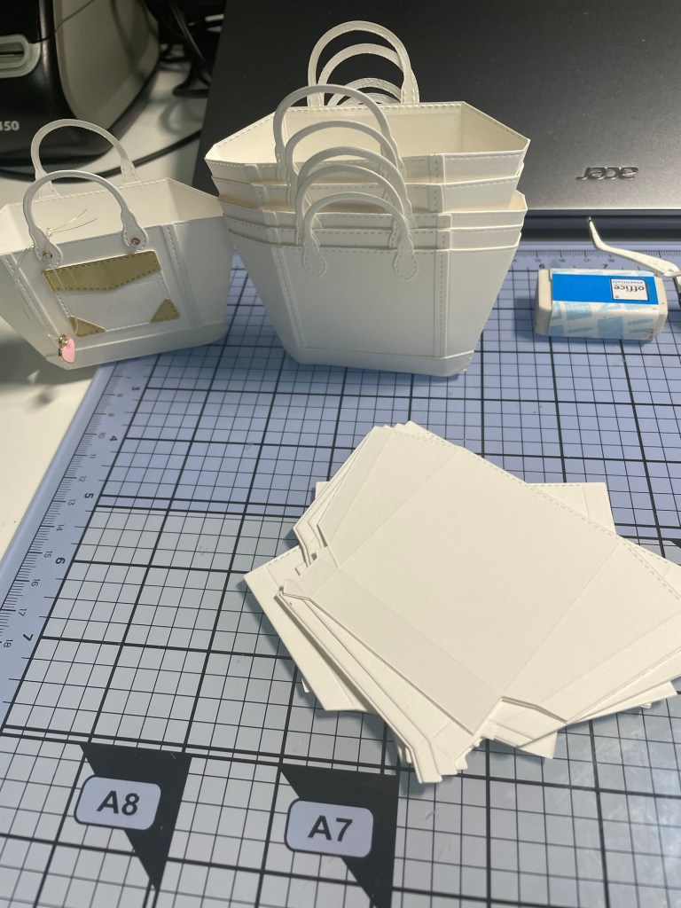 Links zie je mijn voorbeeld tasje en rechts de tasjes in de maak.