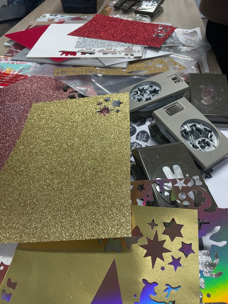 En ik nam ponsen mee en veel bling bling papier: goud en zilver natuurlijk maar ook glitter zilver, glitter rood en glitter goud papier. Glitter roze, velvet wit en velvet rood vonden ze erg mooi, maar de grootste favoriet was wat de kinderen regenboogpapier noemden: een soort koper kleurig papier met een glansje.