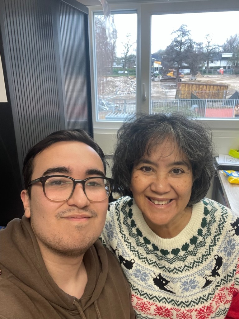 Ik had alles in een wasmand gestopt en het was behoorlijk zwaar. Nick zit nu in een noodgebouw want ze krijgen een nieuw pand. Ik verdwaal overal dus moest ik hem bellen om te vragen waar hij zat en hoe ik moest lopen. Nick kon zelf niet weg maar regelde een jongen uit groep zeven om mijn mand te dragen en de weg te wijzen: super lief, bedankt Thijs. Hij kende mij nog want hij had vorig jaar kerstkaarten bij mij gemaakt toen hij in groep 6 bij meester Nick zat.